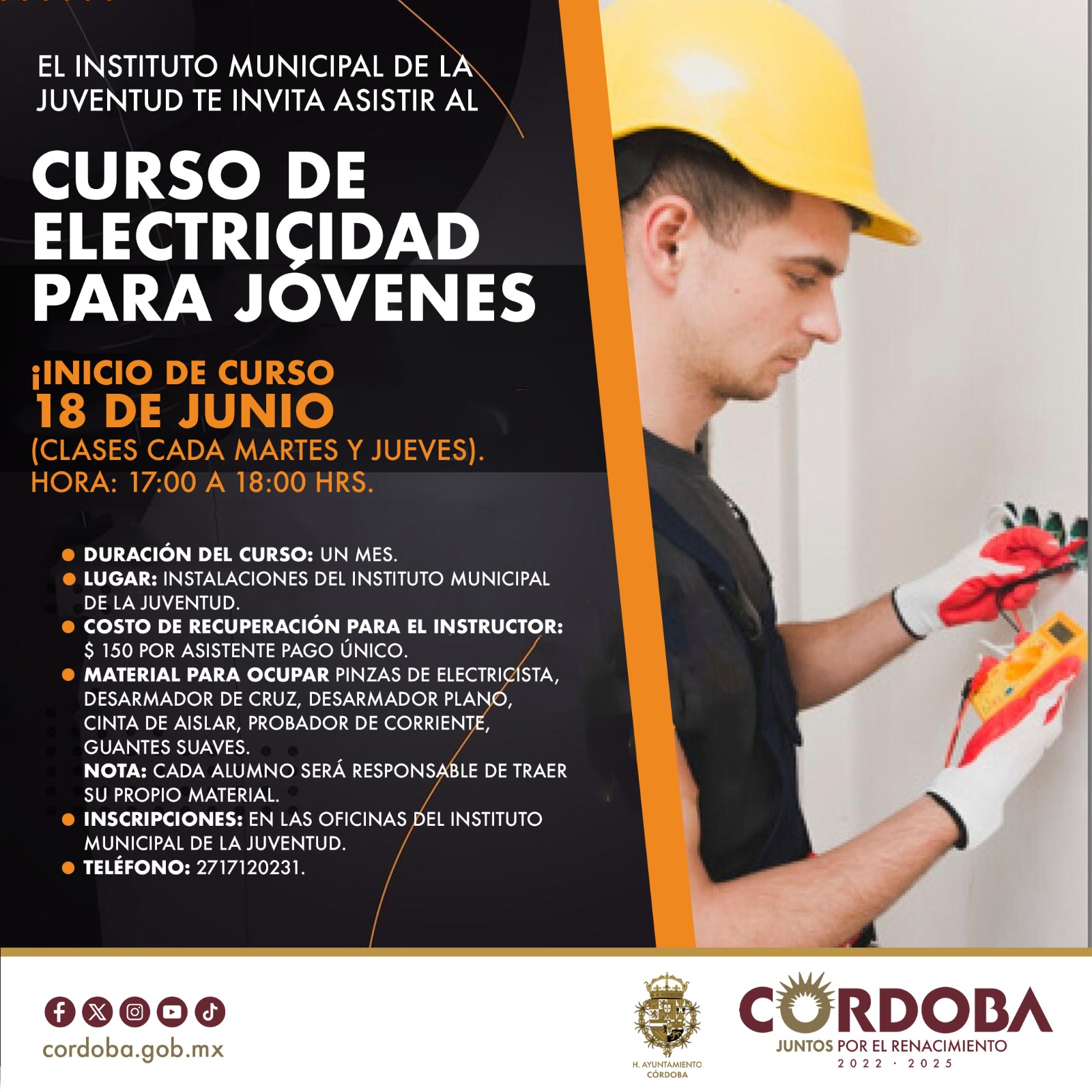 H. Córdoba, Ver. 11 de junio de 2024. – El Instituto Municipal de la Juventud de Córdoba abrió la convocatoria para el curso de electricidad dirigido a personas mayores de 17 años de edad, inicia el 18 de junio informó Valeria Alarcón Martínez de la Muria, titular de esta dependencia.