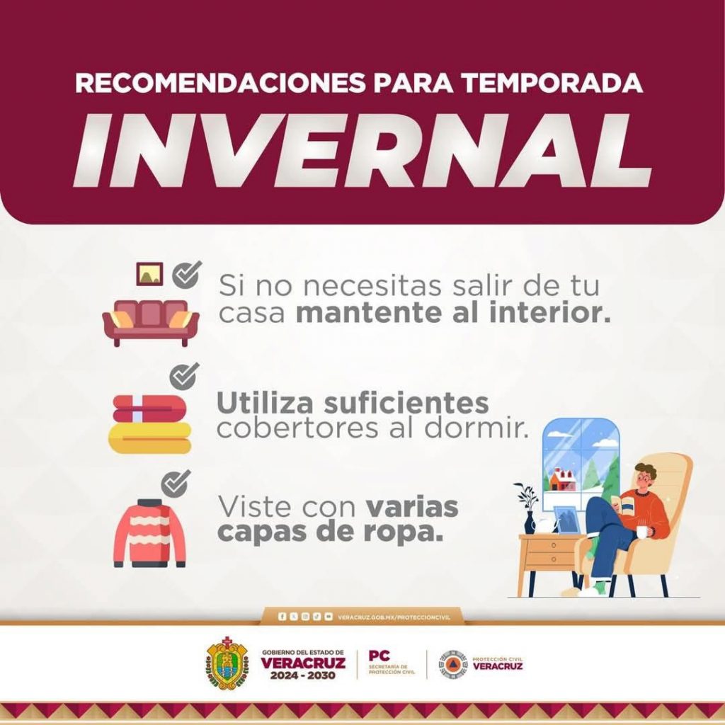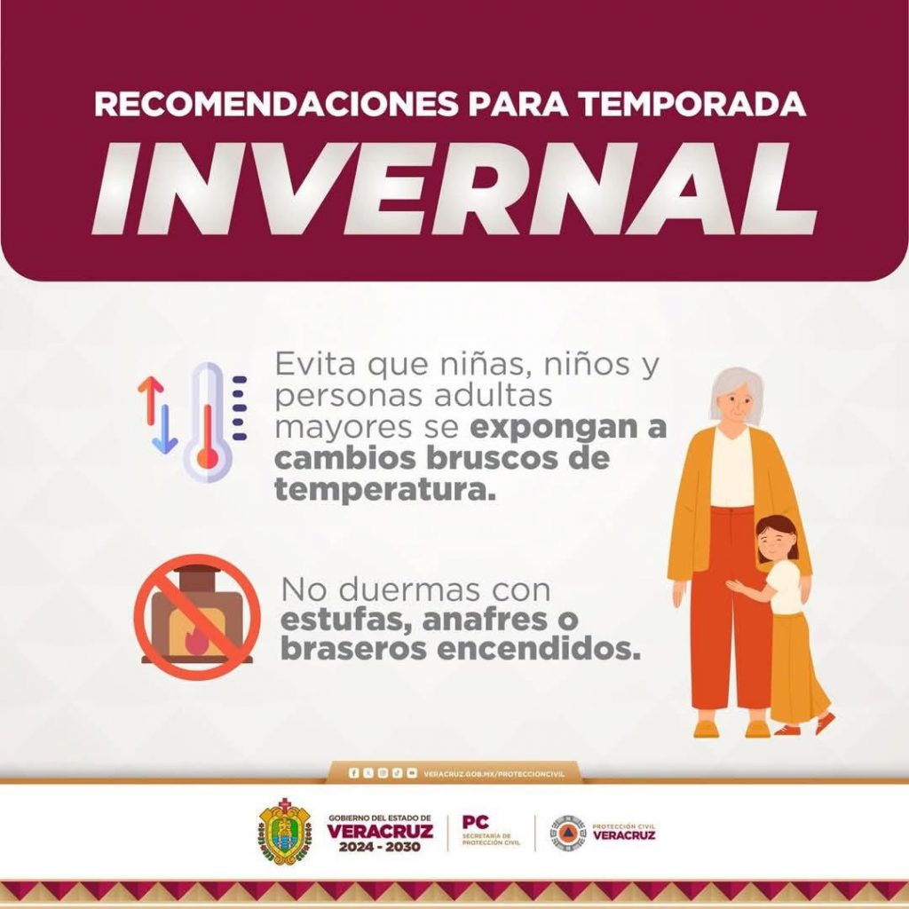Las recomendaciones para esta temporada invernal son, que, si no se necesita salir de su casa, se mantenga en el interior, utilicen suficientes cobertores al dormir y vistan con varias capas de ropa, eviten que niñas niños y personas adultas mayores se expongan a cambios bruscos de temperatura, y por supuesto no dormir con estufas, naves o braceros encendidos.