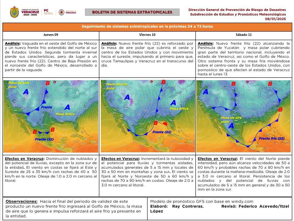 El sábado 11 de enero alcanzará la península de Yucatán con pronósticos que afecten el estado de Veracruz hasta el lunes 13, detalló Tress Martínez.