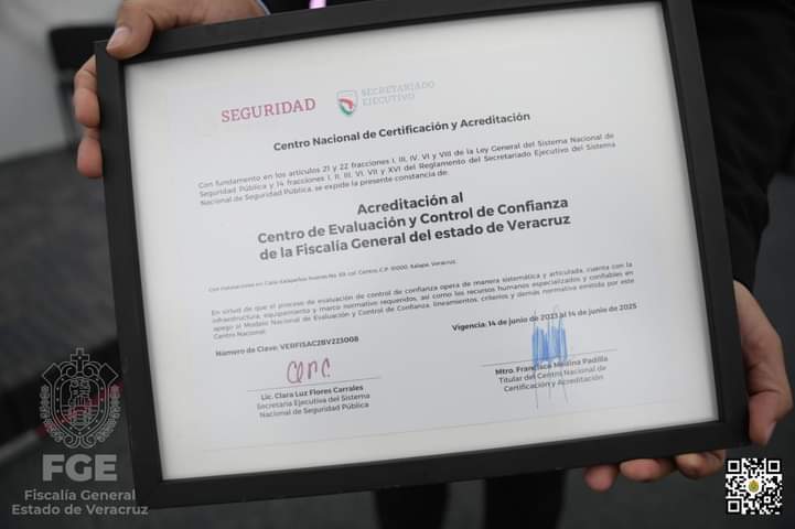 Hernández Giadáns reconoce el trabajo y compromiso de todo el personal que labora en el Centro de Evaluación y que ha hecho posible esta certificación. Destaca la importancia de continuar con el trabajo coordinado con los tres niveles de gobierno, mediante estrategias de seguridad en beneficio de las y los veracruzanos, así como fortalecer la confianza y credibilidad en la Fiscalía General, preservando la paz social.