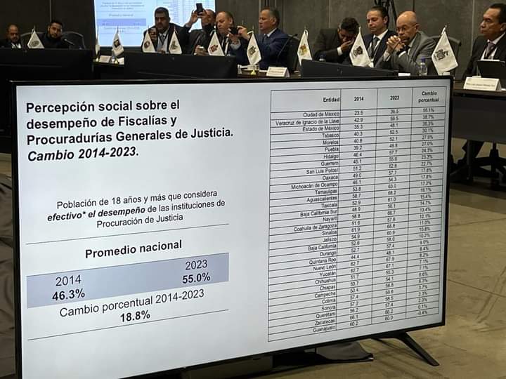 De igual manera se expusieron los indicadores de Percepción Social y Confianza Social sobre el Desempeño de Fiscalías y Procuradurías Generales de Justicia, Cambio 2014-2023, en los que Veracruz ocupa el segundo lugar nacional como Fiscalía mejor evaluada por las y los ciudadanos.