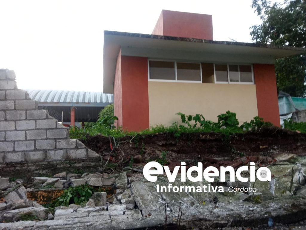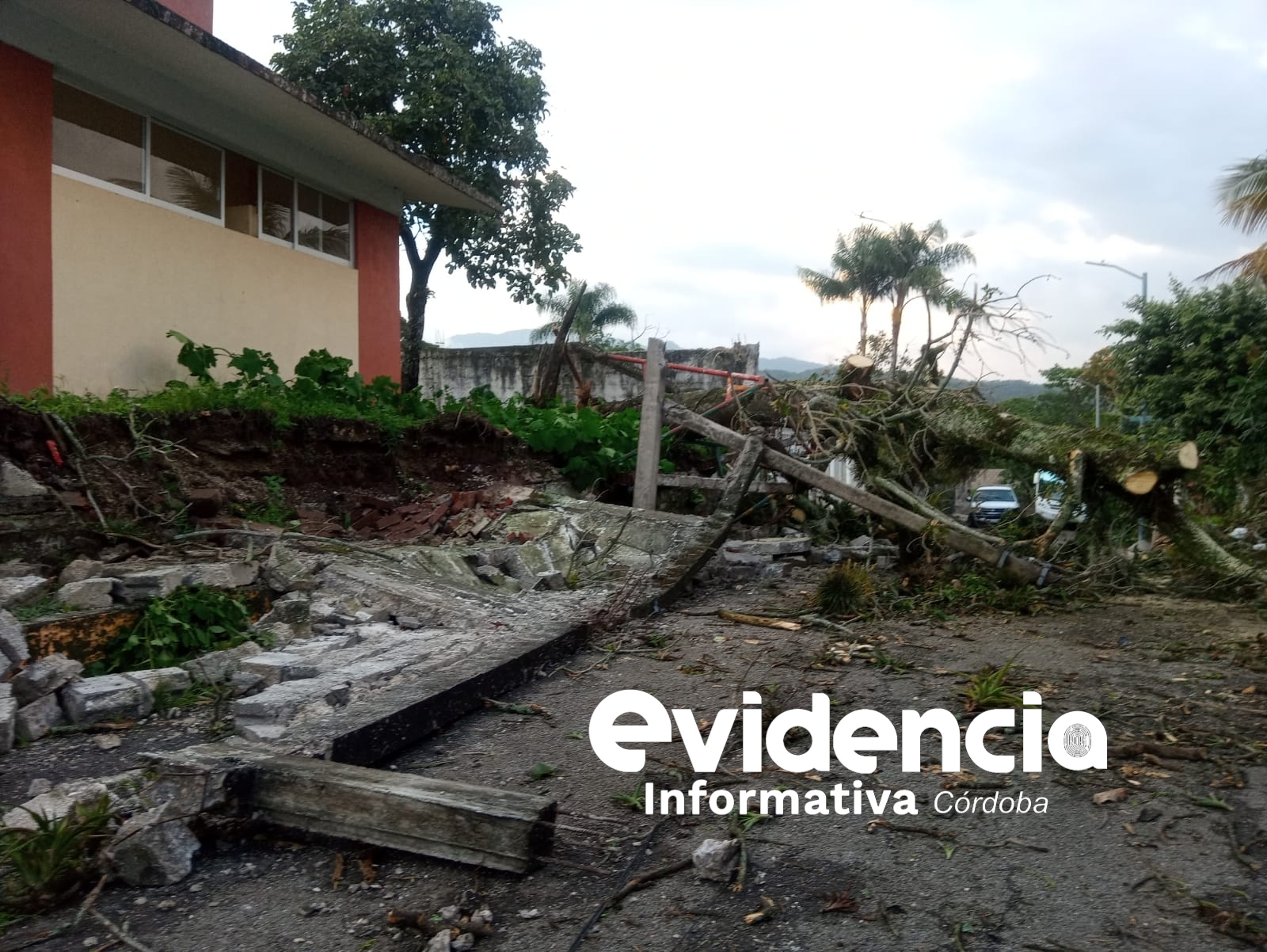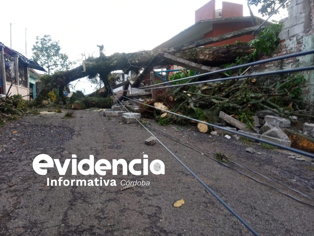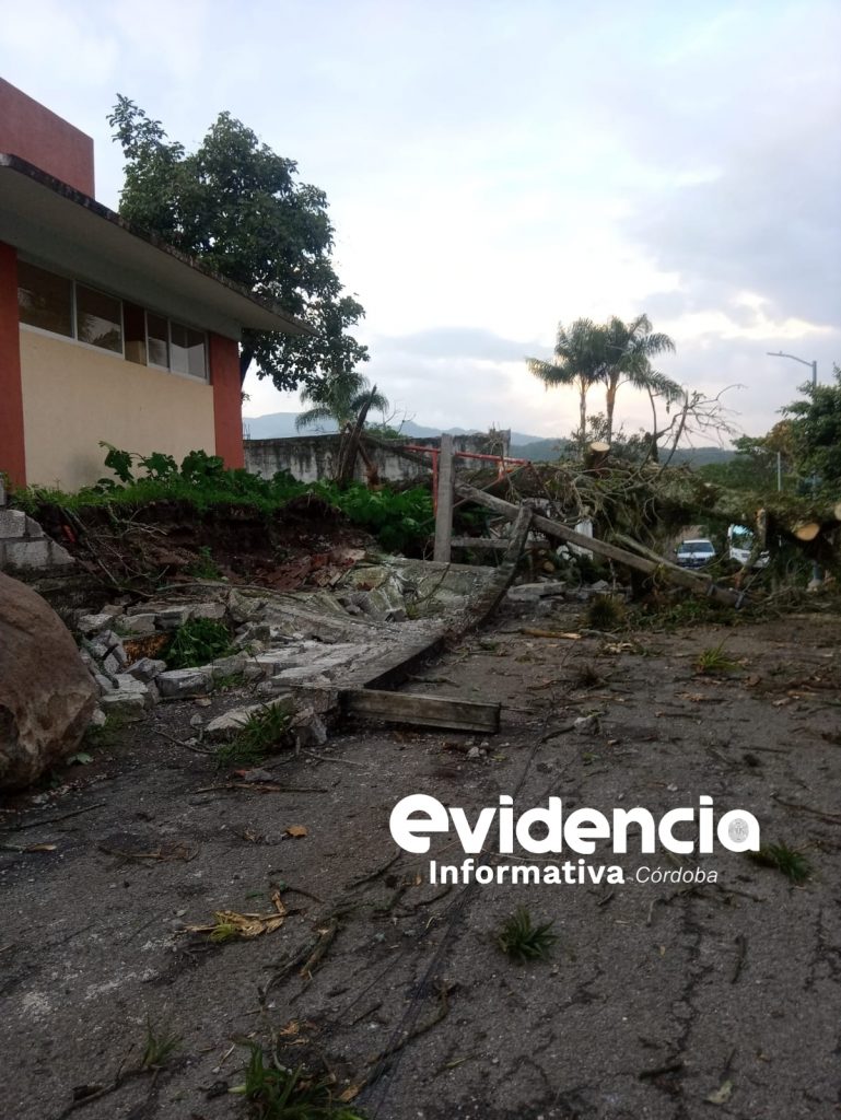 Córdoba.- Daños incalculables luego de que cayera un árbol encima de una barda escolar y parte de un portón de una casa.