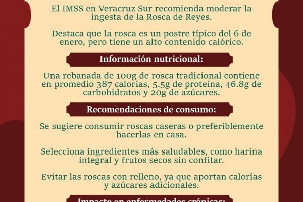 El Instituto Mexicano del Seguro Social (IMSS) en Veracruz Sur recomienda a la población moderar la ingesta de la Rosca de Reyes, la cual además de ser un postre típico de cada 6 de enero, contiene una gran cantidad de calorías, lo que la contraindica especialmente a personas con obesidad, diabetes e hipertensión. El encargado…