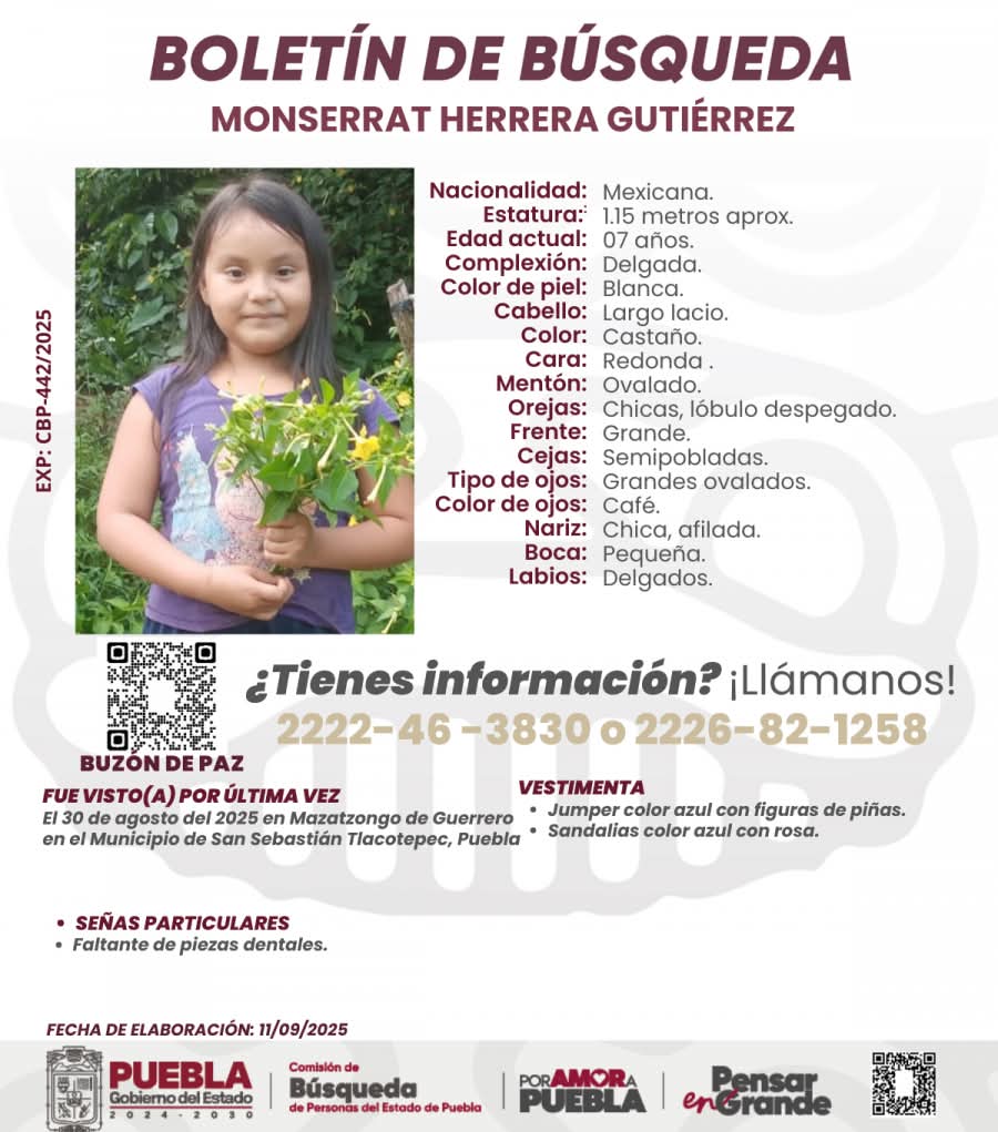 CIUDAD DE PUEBLA, Pue.- El Gobierno de Puebla, a través de la Comisión de Búsqueda de Personas, bajo la coordinación del comisionado Juan Enrique Rivera Reyes y con el respaldo del gobernador Alejandro Armenta, llevó a cabo acciones inmediatas para la localización de la menor Monserrat Herrera Gutiérrez, en la comunidad de Mazatzongo de Guerrero, en Tlacotepec de Porfirio Díaz.