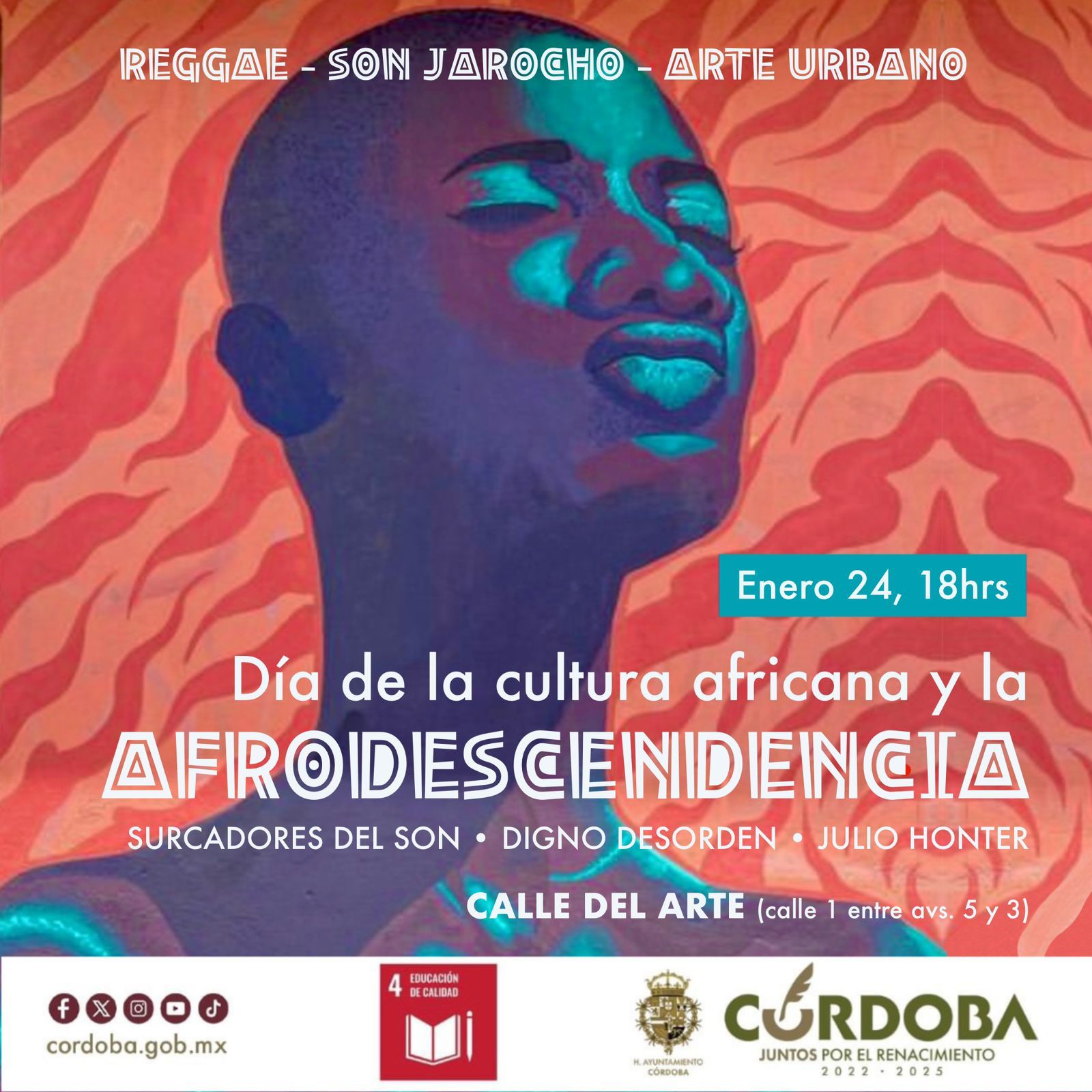 Córdoba, Ver., (23 de enero del 2024). – Debido a la importante población afro descendiente con la que cuenta la ciudad de Córdoba, la Coordinación de Cultura celebrará este miércoles 24 de enero, a este legado con un evento musical y artístico urbano en la calle del Arte (calle 1, avenidas 5 y 3) en punto de las 18 horas, a través del cual, se pretende educar sobre la historia y la cultura de las personas afro descendientes y promover la justicia social e igualdad.