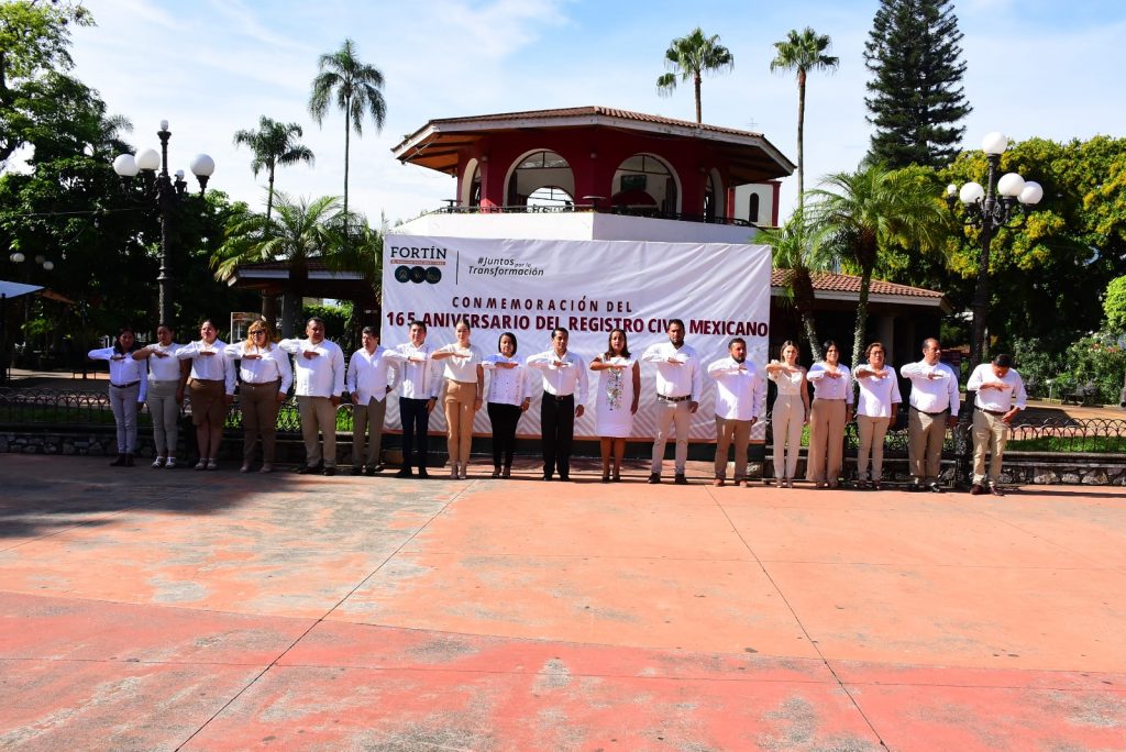Fortín, Ver. – El presidente municipal Gerardo Rosales Victoria encabezó la conmemoración del 165 aniversario del Registro Civil en México, por lo cual se llevó a cabo un acto cívico en la explanada del parque Lázaro Cárdenas con la presencia de 16 oficiales del Registro Civil de la región.