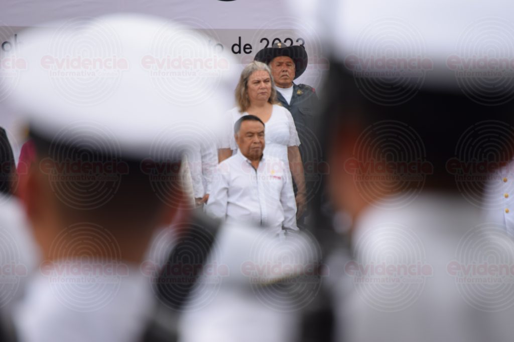 En esta ocasión, el Lábaro Patrio fue arropado por la escolta de la Heroica Escuela Naval Militar, dando paso al izamiento de la Bandera a cargo del Presidente Municipal, Juan Martínez Flores.