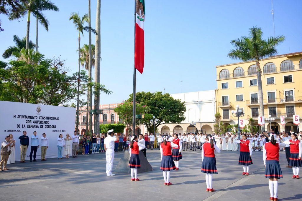 H. Córdoba, Ver. 21 de mayo de 2024.- El 203 Aniversario de la defensa de Córdoba fue conmemorado con honores a la bandera por parte de las autoridades municipales y estudiantes de la escuela primaria 21 de Mayo. También se montó una guardia de honor y ofrenda floral en el parque de la “Casa Quemada”.