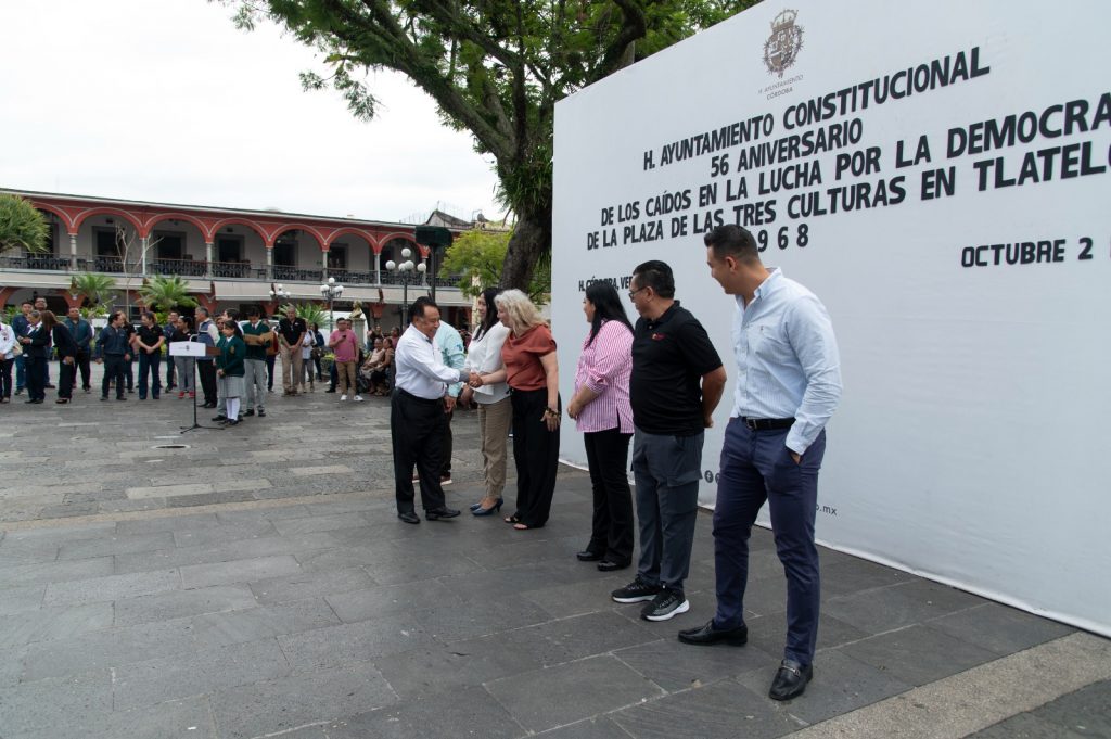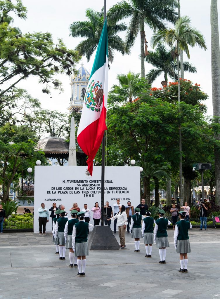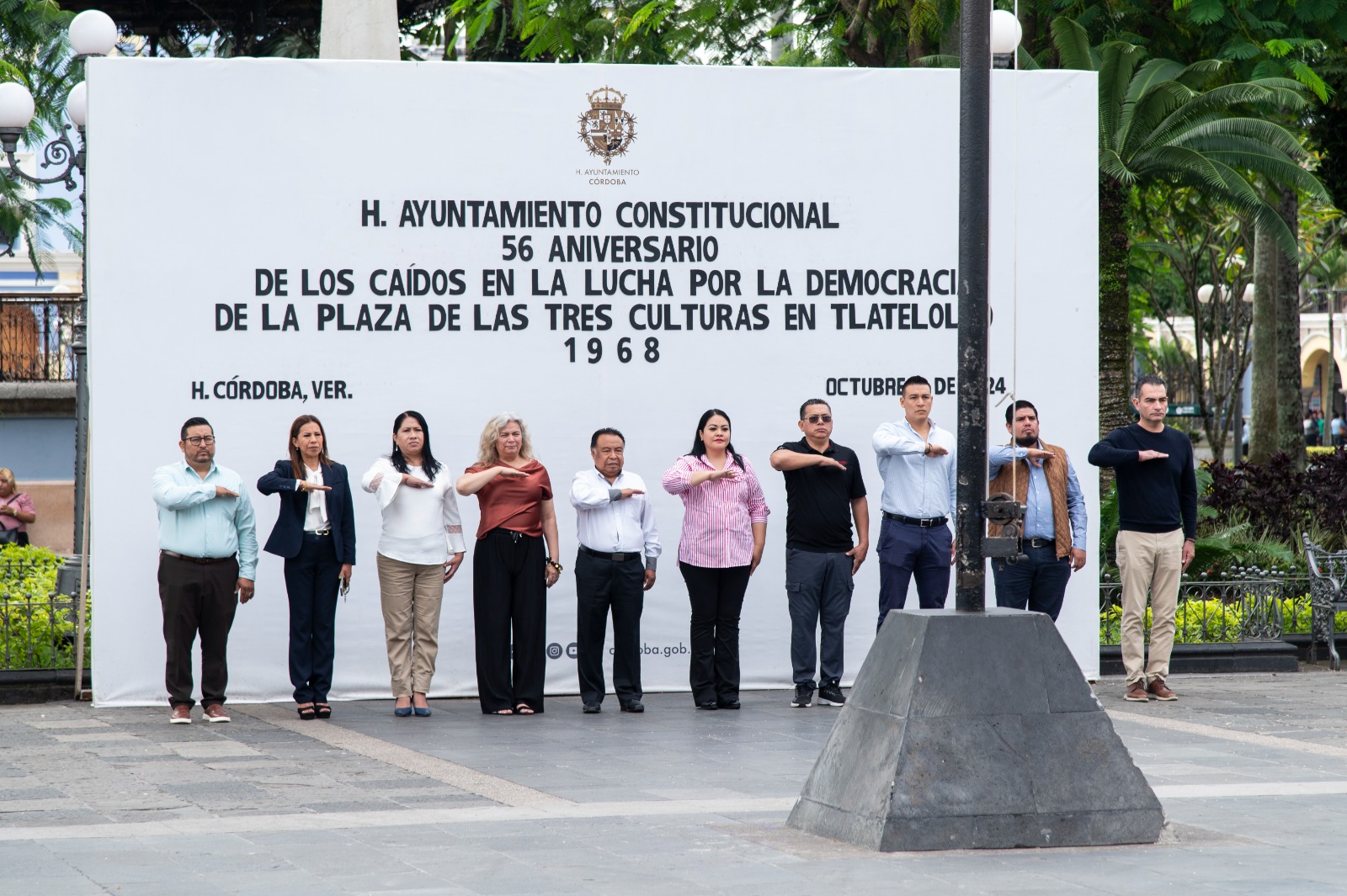 H. Córdoba, Ver., 2 de octubre de 2024.- El Ayuntamiento de Córdoba conmemoró hoy, con un acto cívico, el 56 aniversario de los Caídos en la Lucha por la Democracia en la plaza de las Tres Culturas, en Tlatelolco, en 1968.