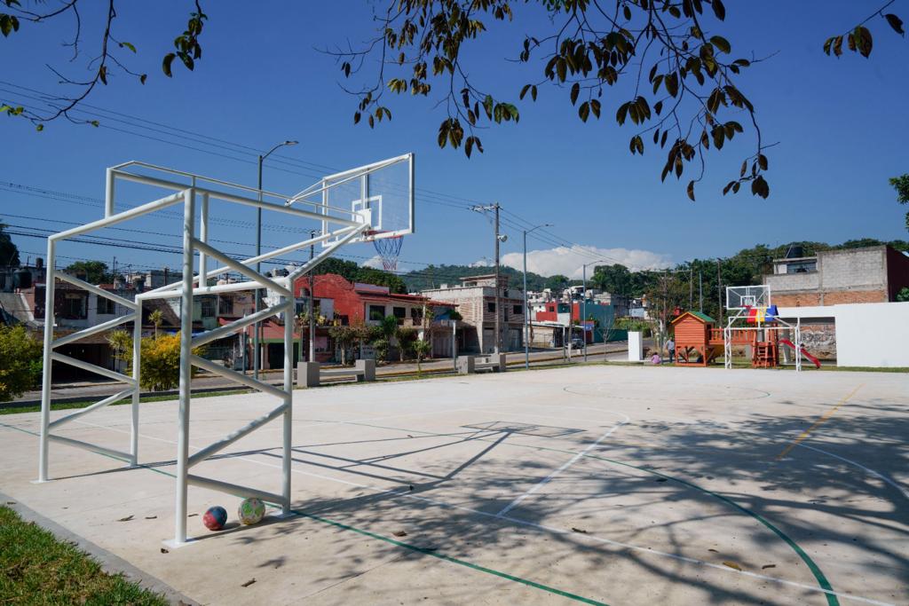 La obra cuenta con cafetería, área de gimnasio, mesas de pin pon, cancha de usos múltiples para disciplinas como basquetbol y fútbol, además de una cancha de frontón, juegos infantiles, sanitarios, andadores de concreto estampado y luminarias para garantizar la seguridad de los asistentes.