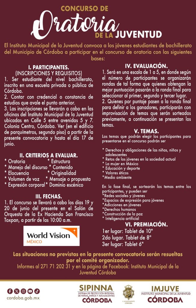 H. Córdoba, Ver. 07 de junio de 2024.- Los jóvenes de Córdoba que cursan preparatoria son convocados a participar en un concurso de oratoria con temas como los derechos y obligaciones de las niñas, niños y adolescentes, retos de los jóvenes en la sociedad actual, adicciones, inteligencia artificial y derechos humanos, anunció Valeria Alarcón Martínez de la Muria, titular del Instituto Municipal de la Juventud.