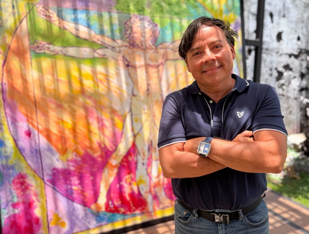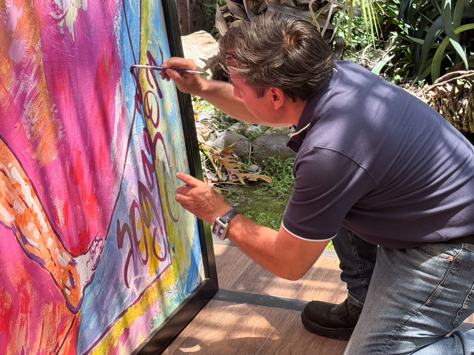 Al finalizar, el pintor realizó la firma de la réplica del “Hombre de Vitruvio” del Italiano Leonardo da Vinci, realizada en su propia versión plasmada con colores más intensos, característico de su estilo.