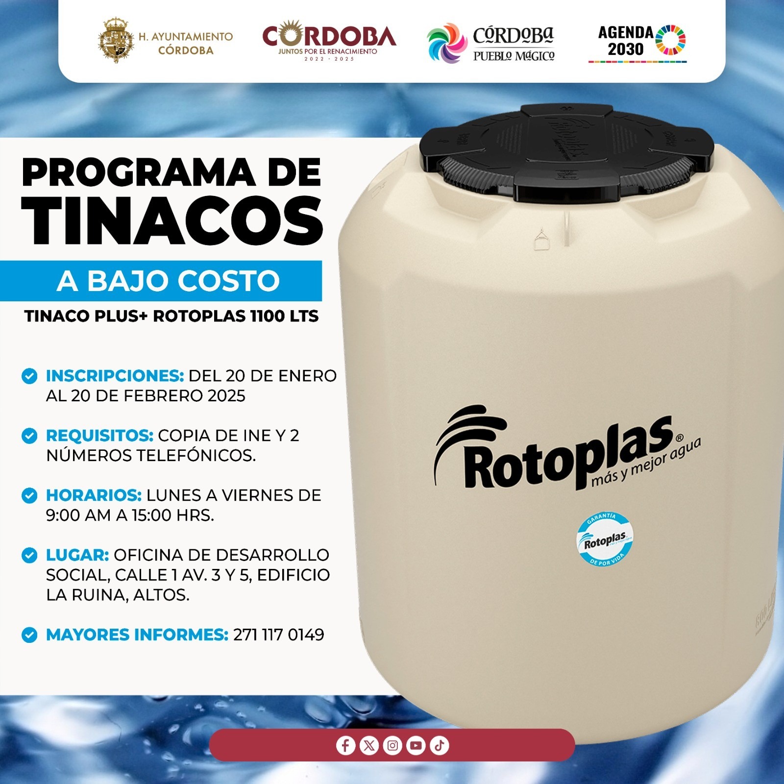 Córdoba Ver. a 16 de enero de 2025.- Para continuar con el apoyo a la economía de las familias cordobesas, el Ayuntamiento a través de la dirección de Desarrollo Social, apertura este año el Programa de Tinacos a Bajo Costo.