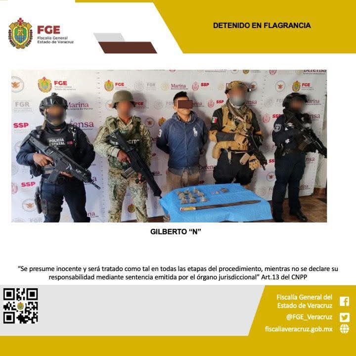 Teocelo, Ver., a 15 de febrero del 2025.-La Fiscalía General del Estado informa que, Fiscales, Peritos y Policías Ministeriales adscritos a la Fiscalía Regional Xalapa, en coordinación con la Secretaría de la Defensa Nacional y la Secretaría de Seguridad Pública Estatal, detuvieron en flagrancia a Gilberto “N” como probable responsable de los delitos contra las instituciones de seguridad pública y contra la salud.