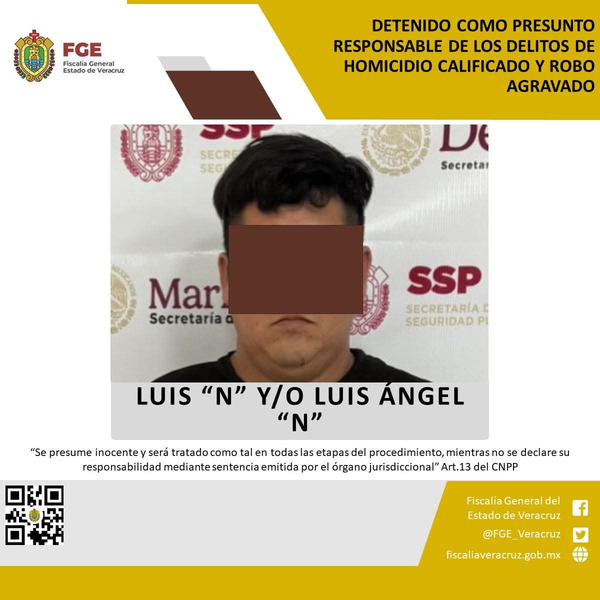Veracruz, Ver., a 14 de agosto de 2025.- La Fiscalía General del Estado informa que, elementos de la Policía Ministerial cumplimentaron orden de aprehensión en contra de Luis “N” y/o Luis Ángel “N” como presunto responsable de los delitos de homicidio calificado, cometido en agravio de la víctima identificada con las iniciales C.G.H., y robo agravado, en agravio de la misma víctima y las identificadas con las iniciales O.G.B., A.C.B.U., O.G.B., y P.M.R.