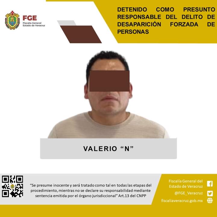 Xalapa, Ver., a 6 de mayo de 2024.- La Fiscalía General del Estado informa que elementos de la policía ministerial cumplimentaron orden de aprehensión en contra de Valerio “N” quien fungía como policía municipal de Xalapa, como presunto responsable del delito de desaparición forzada de personas cometido en agravio de la víctima A.M.V.