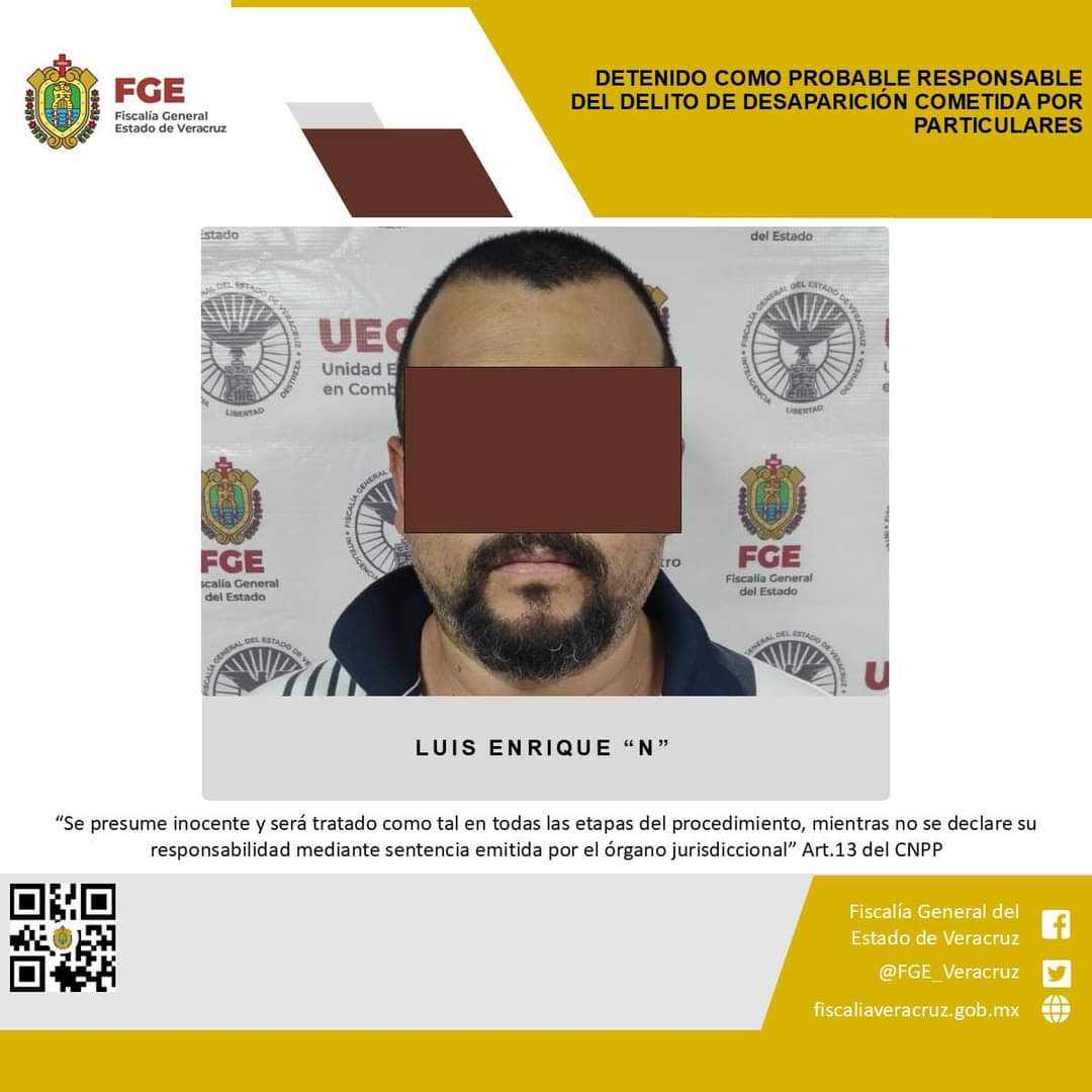 Xalapa, Ver., a 5 de noviembre de 2024.-La Fiscalía General del Estado informa que, elementos de la Policía Ministerial, adscritos a la Fiscalía Especializada para la Atención de Denuncias por Personas Desaparecidas, cumplimentaron orden de aprehensión en contra de Luis Enrique “N”, como probable responsable del delito de desaparición cometida por particulares, cometido en agravio de las víctimas identificadas con las iniciales S.L.S., M.H.B., y N.R.H.