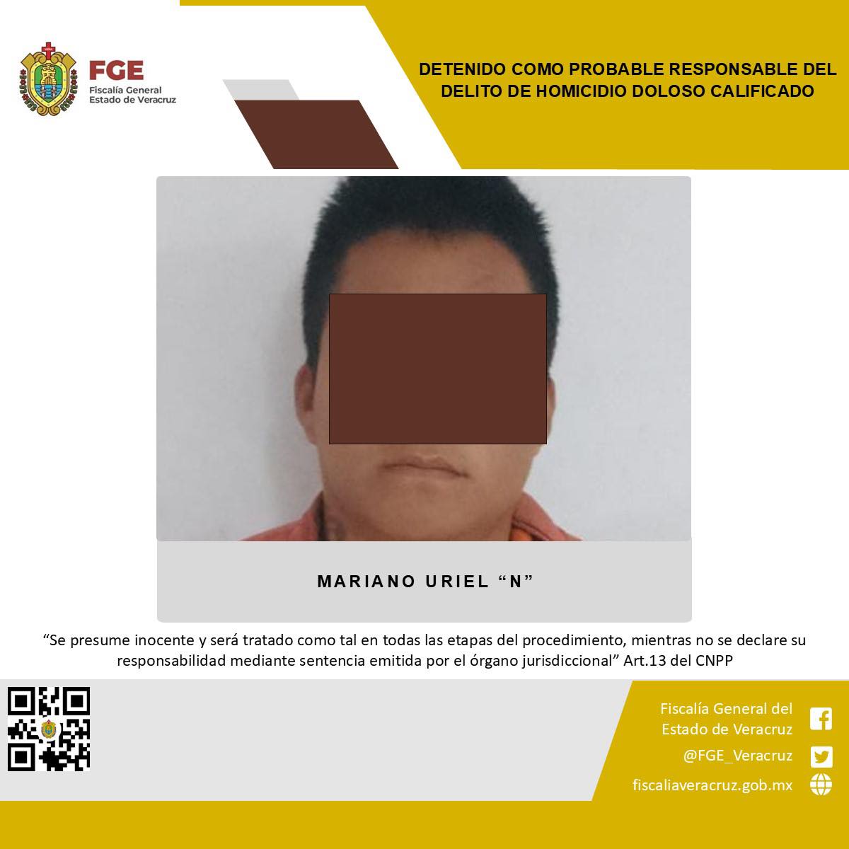 Xalapa, Ver., 24 de diciembre de 2024.-La Fiscalía General del Estado informa que, elementos de la Policía Ministerial cumplimentaron orden de aprehensión en contra de Mariano Uriel “N”, considerado presunto alto generador de violencia y líder de una cédula delictiva en la zona de Cosautlán de Carvajal, como probable responsable del delito de homicidio doloso calificado, cometido en agravio de L.A.C.G.