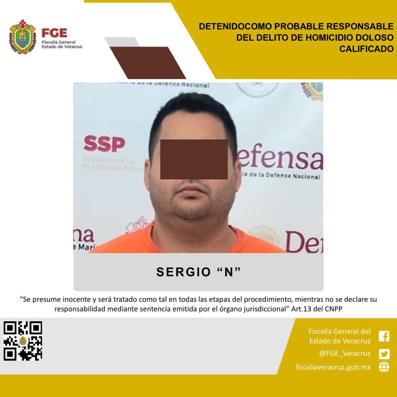 Jalacingo, Ver., 24 de septiembre de 2025.- La Fiscalía General del Estado informa que, elementos de la Policía Ministerial adscritos a la Fiscalía Regional Xalapa, cumplimentaron una orden de aprehensión en contra de Sergio “N” como probable responsable del delito de homicidio doloso calificado, cometido en agravio de la víctima identificada con las iniciales J.S.L.