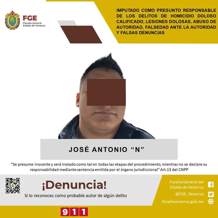 Coatzacoalcos, Ver; a 14 agosto del 2023.- La Fiscalía General del Estado, encabezada por Verónica Hernández Giadáns informa que elementos de la policía ministerial cumplimentaron orden de aprehensión en contra del policía estatal José Antonio “N” como presunto responsable de los delitos de homicidio doloso calificado cometido en agravio de la víctima A.M.M, y lesiones dolosas, abuso de autoridad, falsedad ante la autoridad y falsas denuncias cometido en agravio de R.S.A.