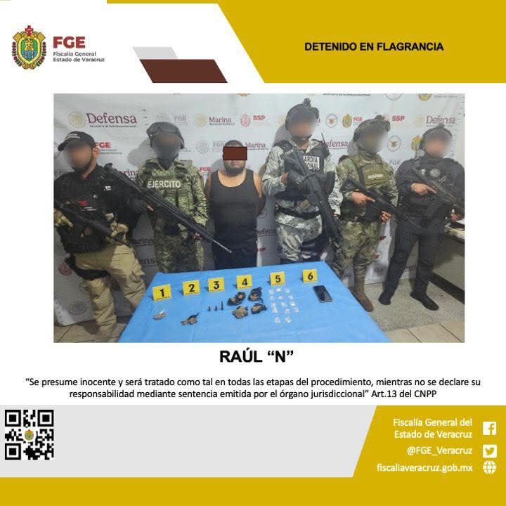 Ciudad Mendoza, Ver., a 20 de febrero del 2025.-La Fiscalía General del Estado informa que, Fiscales, Peritos y Policías Ministeriales adscritos a la Fiscalía Regional Córdoba, en coordinación con la Secretaría de la Defensa Nacional, Secretaría de Marina, Guardia Nacional y la Secretaría de Seguridad Pública Estatal, detuvieron en flagrancia a Raúl “N”.