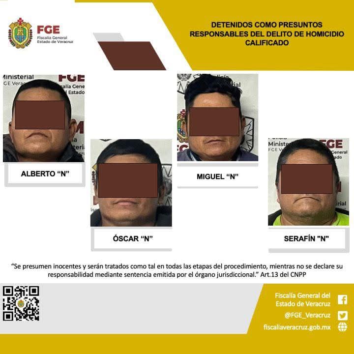 Veracruz, Ver., 22 de enero del 2025.-La Fiscalía General del Estado informa que, elementos de la Policía Ministerial, cumplimentaron en la localidad de Real del Oro, perteneciente al municipio de Úrsulo Galván, orden de aprehensión en contra de Alberto “N”, Óscar “N”, Miguel “N” y Serafín «N» como presuntos responsables del delito de homicidio calificado, cometido en agravio de ocho víctimas de identidad resguardada.