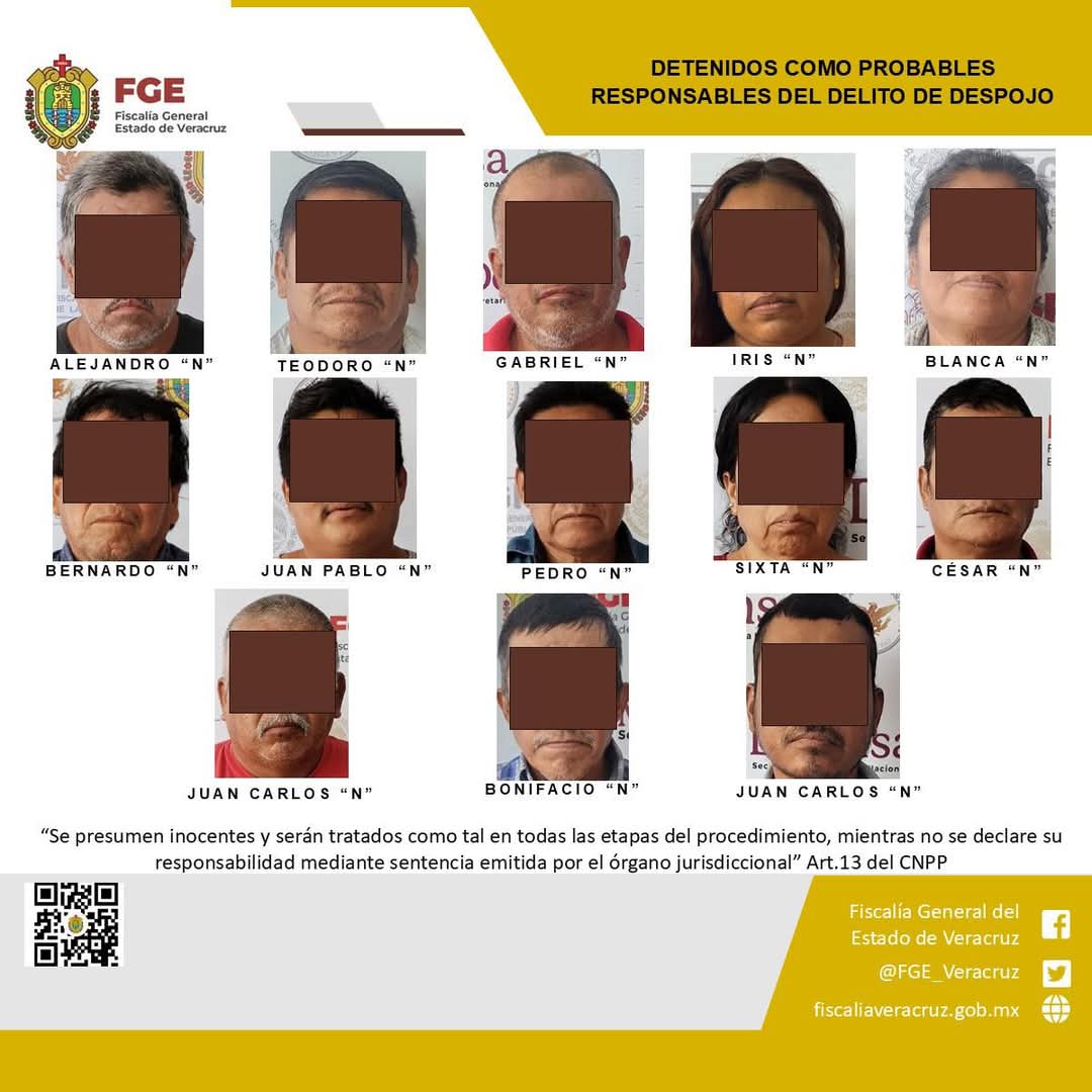 Tuxpan, Ver., a 27 de marzo del 2025.-La Fiscalía General del Estado informa que, elementos de la policía ministerial, en colaboración con la Secretaría de la Defensa Nacional, Secretaría de Marina y la Secretaría de Seguridad Pública Estatal, cumplimentaron orden de aprehensión en contra de Alejandro “N”, Teodoro “N”, Gabriel “N”, Iris “N”, Blanca “N”, Bernardo “N”, Juan Pablo “N”, Pedro “N”, Sixta “N”, César “N”, Juan Carlos “N”, Bonifacio “N” y Juan Carlos “N”, como probables responsables del delito de despojo, cometido en agravio de la víctima identificada con las iniciales M.L.R.U.