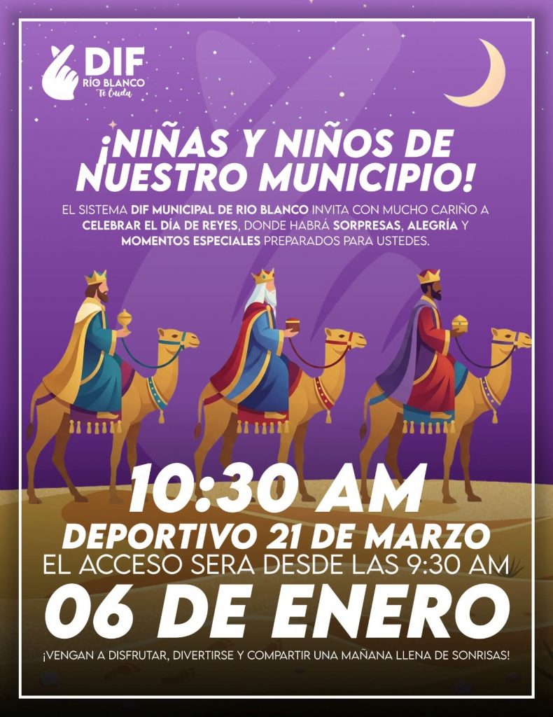 - El Ayuntamiento de Río Blanco, a través del Sistema DIF Municipal, convoca a niñas y niños a disfrutar de un festival lleno de ilusión, regalos y momentos especiales este 6 de enero en el Deportivo 21 de Marzo.