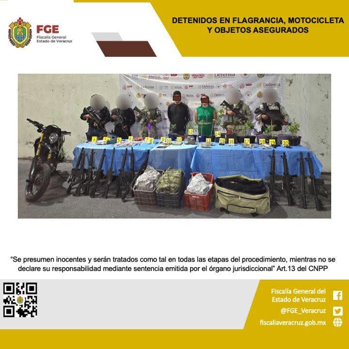 En dicho operativo se logró la detención en flagrancia de Uriel Rafael “N” y Andrea Janeth “N”. Así como el aseguramiento de polvo blanco granulado con características similares al cristal, hierba seca con características similares a las de la marihuana y plantas de lo que aparenta ser la misma droga, bolsas tipo ziploc, básculas grameras, una máquina selladora, dinero en efectivo, pipas, una pastilla color rosa y una laminilla de colores, teléfonos celulares, una tableta electrónica, objetos con características de armas de fuego, ropa táctica y una motocicleta.