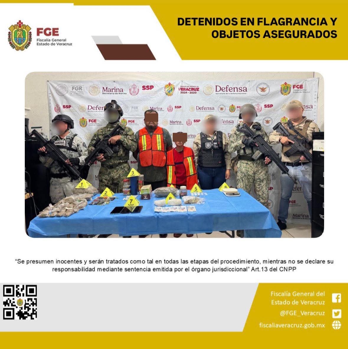 En dicho operativo se logró la detención en flagrancia de Luis Alberto “N” y María de Lourdes “N”. Asimismo se aseguró hierba verde seca con características similares a las de la marihuana, una sustancia granulada color blanco, memorias USB, sábanas para la presunta elaboración de cigarros, un molinillo, una báscula gramera, celulares, prendas de ropa, dinero en efectivo y una motoneta.