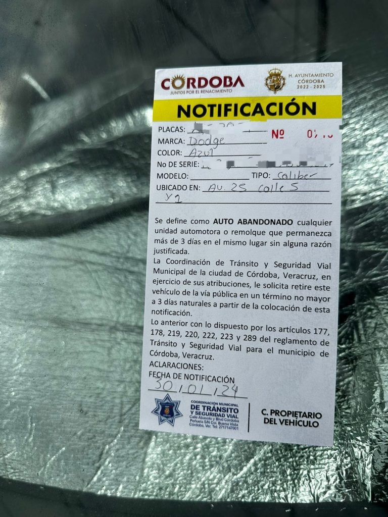 Córdoba, Ver. 2 de febrero del 2024.- Un total de 35 notificaciones ha emitido la Coordinación de Tránsito Municipal en Córdoba lo que va del año a propietarios de vehículos en condiciones de abandono en la vía pública, acciones que se realizan en apego al Artículo 223 del Reglamento de Tránsito, señaló Silvio García Rabanales coordinador del área.