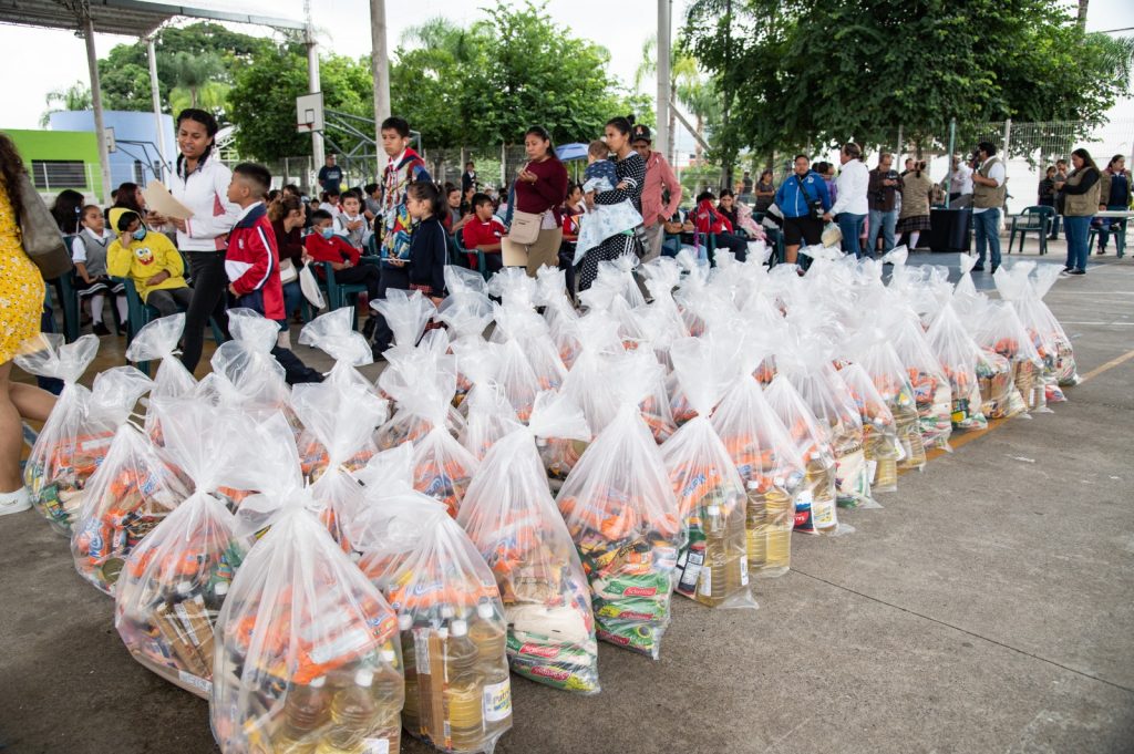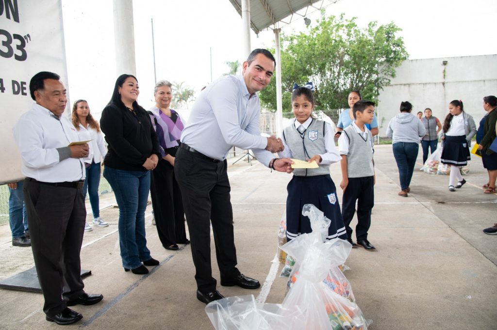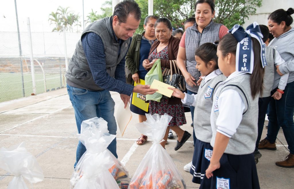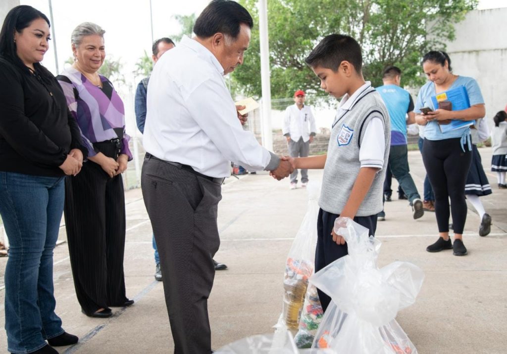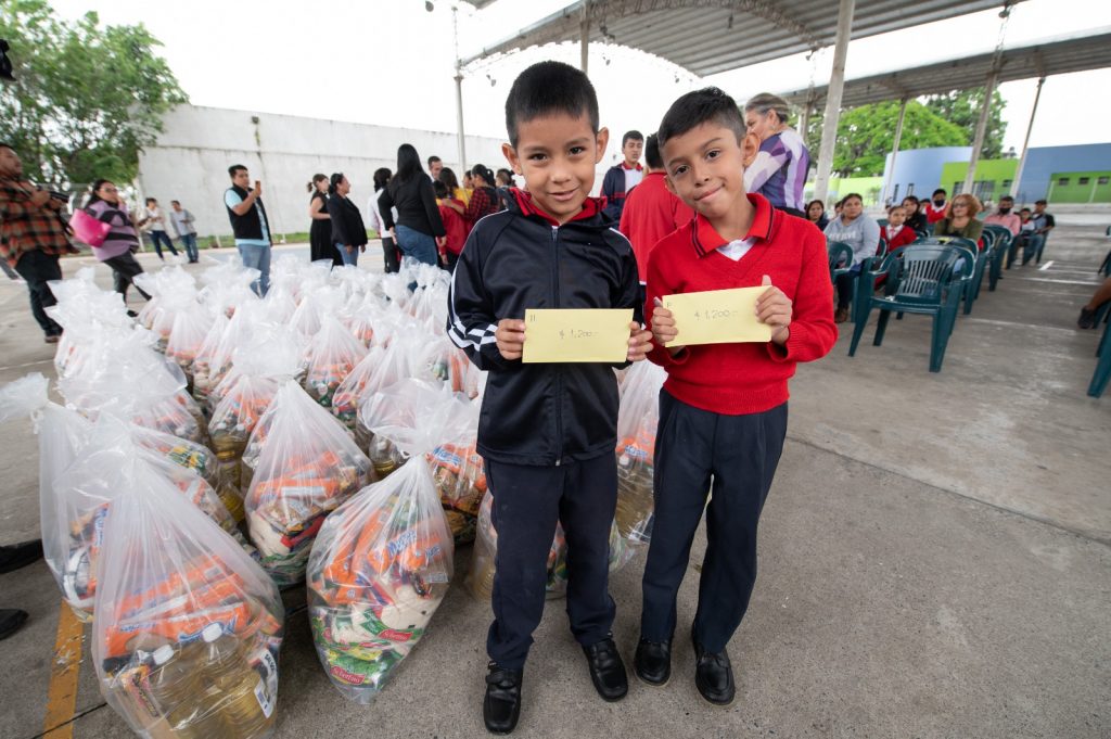 En las canchas externas del gimnasio El Mexicano, las autoridades municipales realizaron la entrega simbólica de becas y despensas a los estudiantes de las escuelas primarias 5 de Mayo y General Antonio Porras, no obstante, será hasta el viernes que se concluya con la dispersión de los estímulos a las instituciones beneficiadas en este ejercicio fiscal.