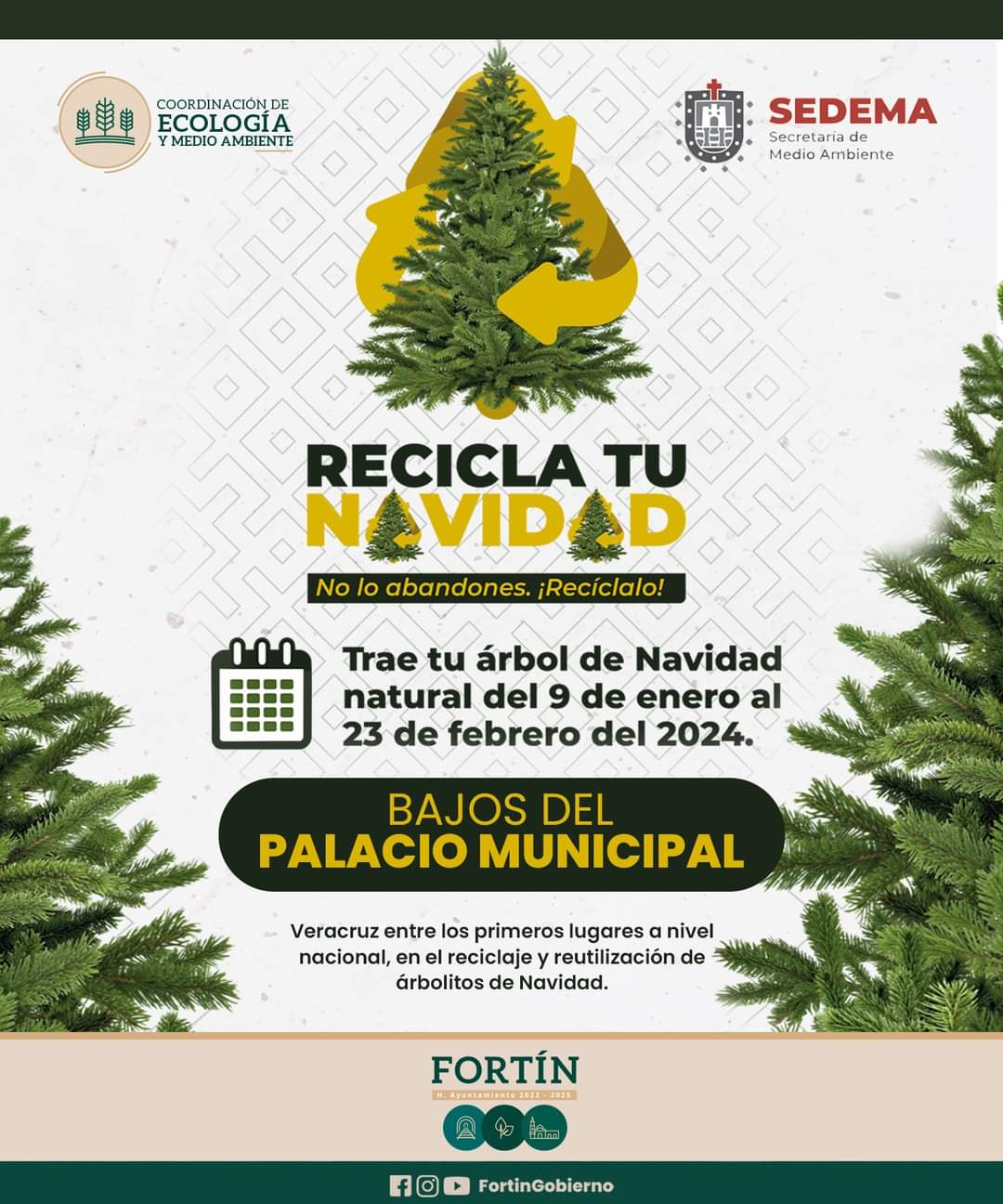 Fortín, Ver. – La Dirección de Servicios Municipales a través de la coordinación de Ecología y Medio Ambiente exhortan a la población a reciclar su pino de navidad, por lo cual pueden llevarlo al módulo de recepción que se ubica en los bajos del palacio municipal y estará vigente hasta el 23 de febrero.