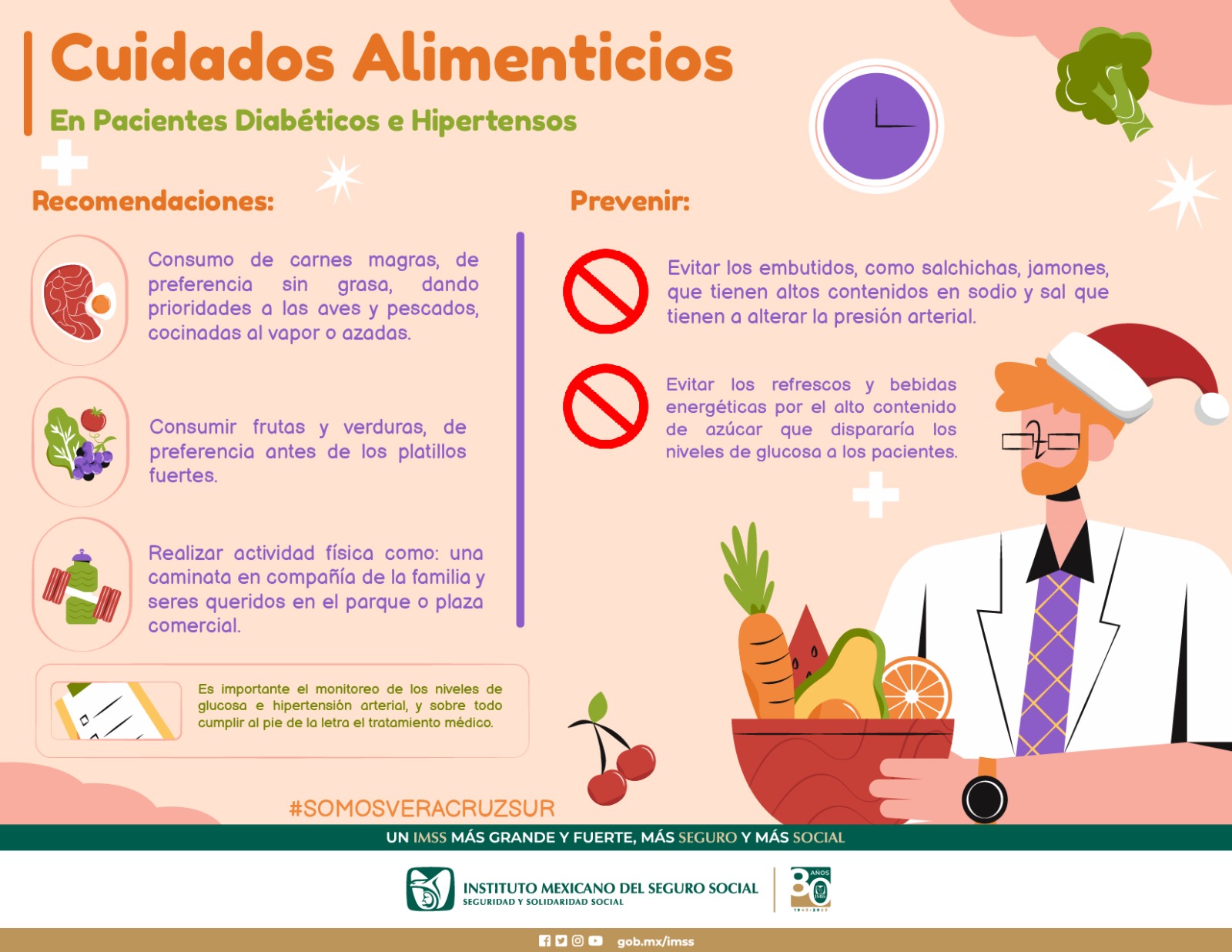 A fin de disfrutar las fiestas decembrinas, el Instituto Mexicano del Seguro Social (IMSS) Veracruz Sur exhorta a los pacientes diabéticos e hipertensos a cuidar la cantidad y calidad de alimentos en la mañana, tarde y noche, sin olvidar la toma de sus medicamentos.