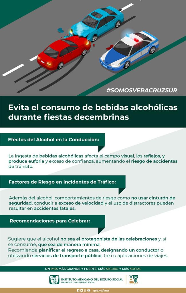 Las fiestas decembrinas suelen estar acompañadas de celebraciones y momentos sociales que involucran el consumo de alcohol, por ello, el Instituto Mexicano del Seguro Social (IMSS) en Veracruz Sur recomienda a la población en general a festejar y disfrutar de estas ocasiones de manera responsable.