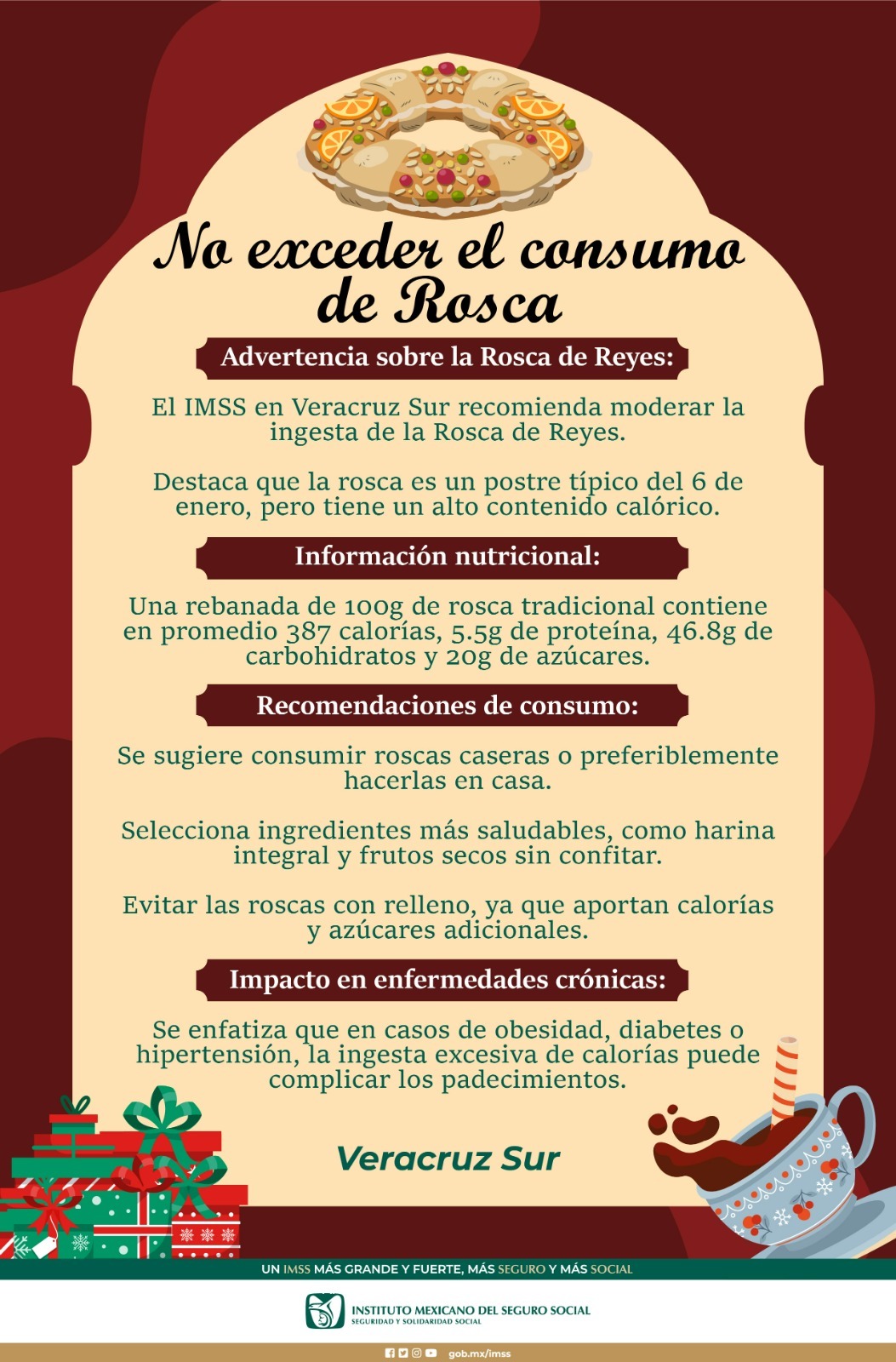 El Instituto Mexicano del Seguro Social (IMSS) en Veracruz Sur recomienda a la población moderar la ingesta de la Rosca de Reyes, la cual además de ser un postre típico de cada 6 de enero, contiene una gran cantidad de calorías, lo que la contraindica especialmente a personas con obesidad, diabetes e hipertensión.