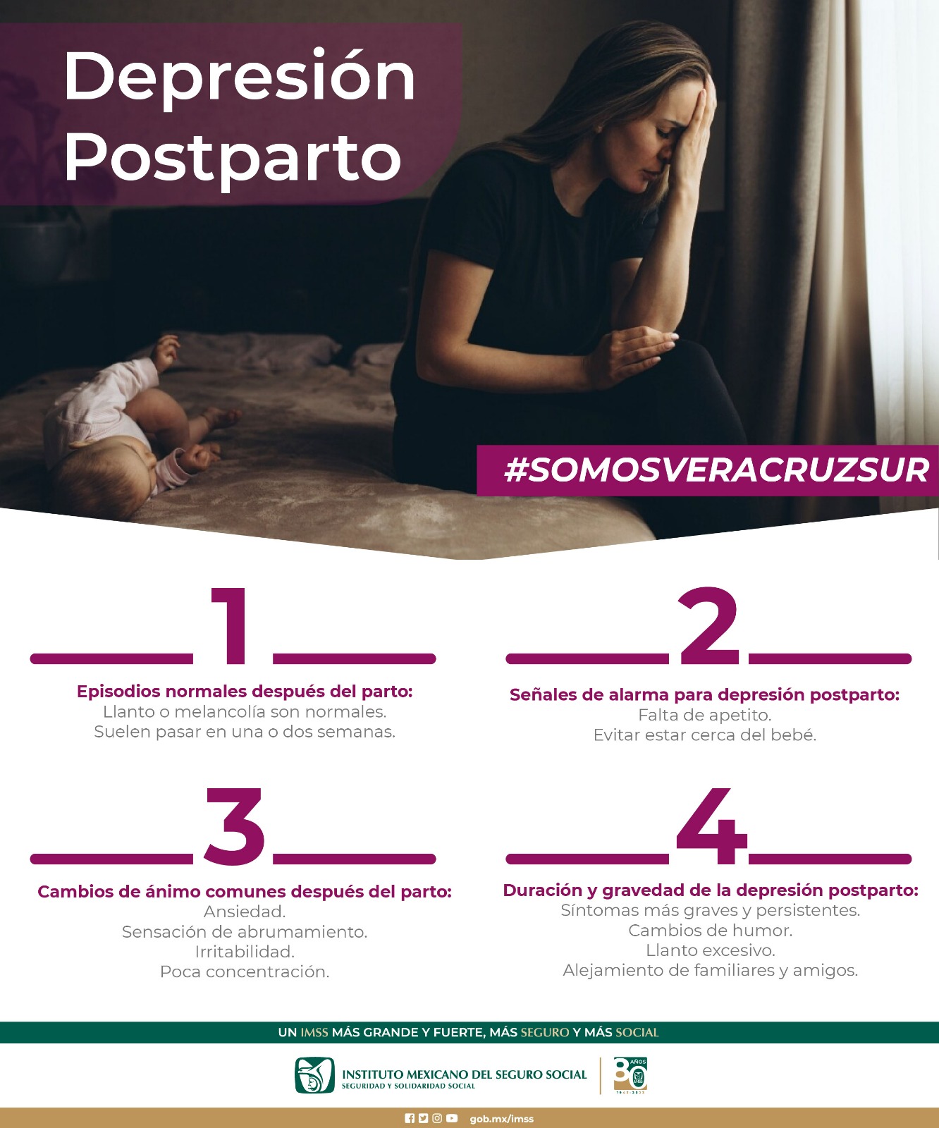 El Instituto Mexicano del Seguro Social (IMSS) en Veracruz Sur informa que después de tener un hijo es normal tener episodios de llanto o melancolía, lo cual se pasa en una o dos semanas, pero la falta de apetito o el no querer estar cerca de su bebé es una señal de alarma para una probable depresión postparto.