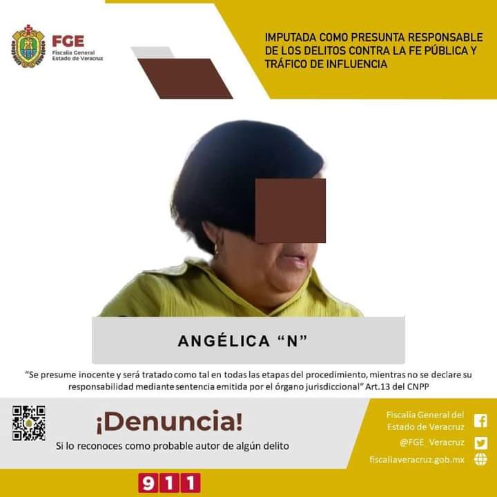 Xalapa, Ver., .- La Fiscalía General del Estado informa que, a través de la Fiscalía de Investigaciones Ministeriales, obtuvo la imputación de Angélica «N» como presunta responsable de los delitos contra la fe pública y tráfico de influencia, cometidos en agravio de la fe pública y el servicio público respectivamente.