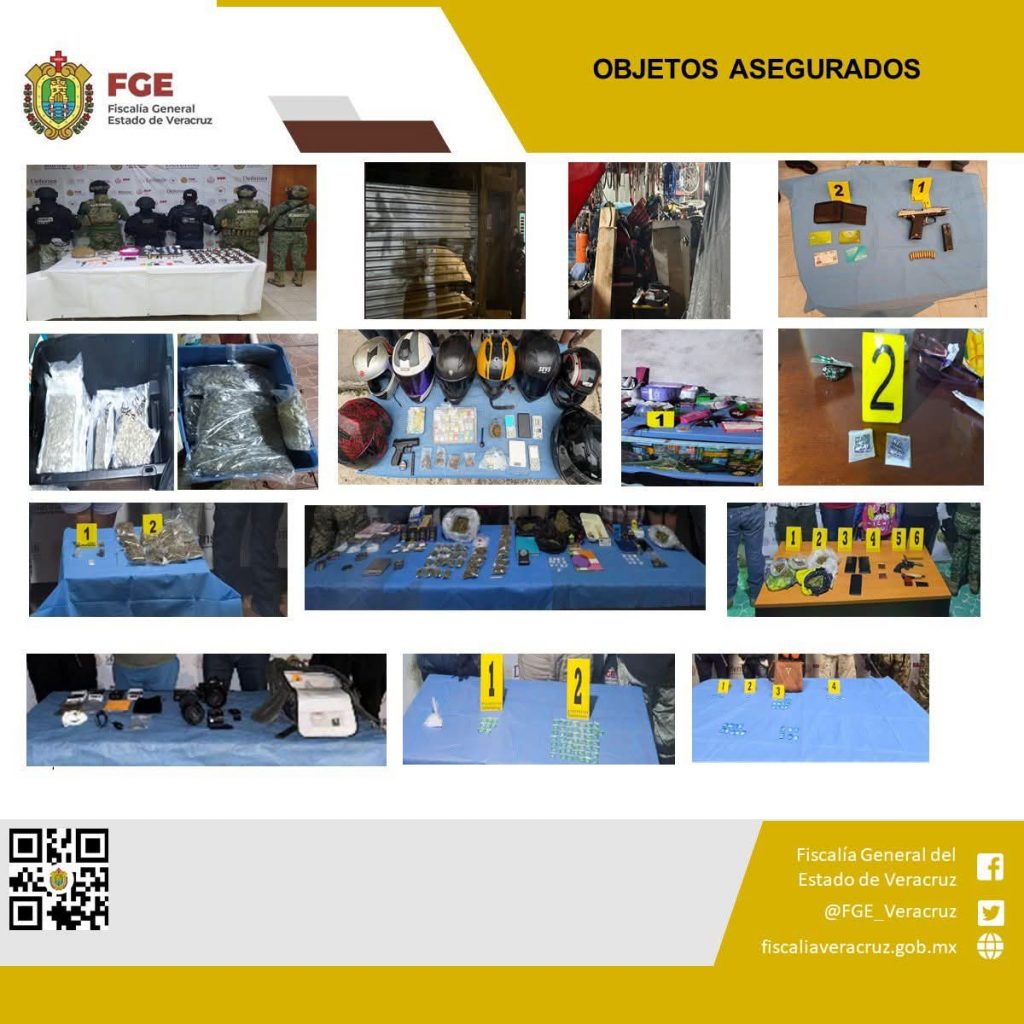 Los cateos se efectuaron en los municipios de Tuxpan, Coatzacoalcos, Minatitlán, Xalapa, Altotonga, Tlapacoyan, Martínez de la Torre, Coatepec, Magdalena y Mariano Escobedo, donde fueron asegurados, entre otros objetos, pipas, bolsas tipo ziploc, una sustancia con características similares al cristal, básculas y jarras grameras, trituradoras, cartuchos balísticos, una pistola de diábolos, cámaras de videograbación, hierba verde seca con características similares a la marihuana.