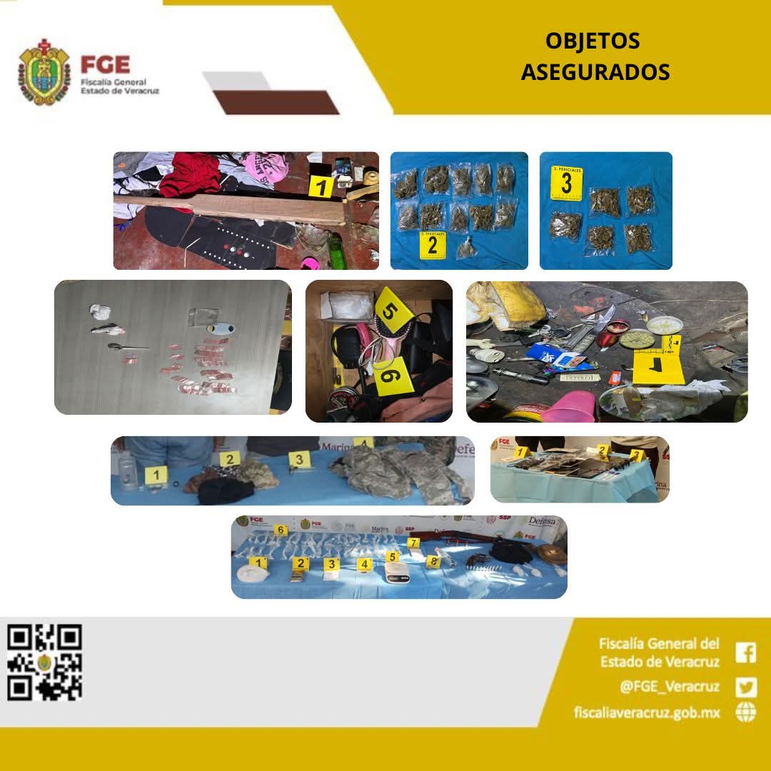 En los municipios de Cardel, Álamo Temapache, Minatitlán, Tuxpan, Jalacingo, Playa Vicente, fueron asegurados pipas, hierba seca con características similares a la marihuana, piedra granulada y polvo blanco con características similares al cristal, una tabla de castigo, pasamontañas, una camisola, radios, cartuchos de arma de fuego, teléfonos celulares, una mira telescópica, un arma corta, un arma larga, una báscula gramera, una báscula digital, grinders, un triturador y un cargador metálico para arma larga.