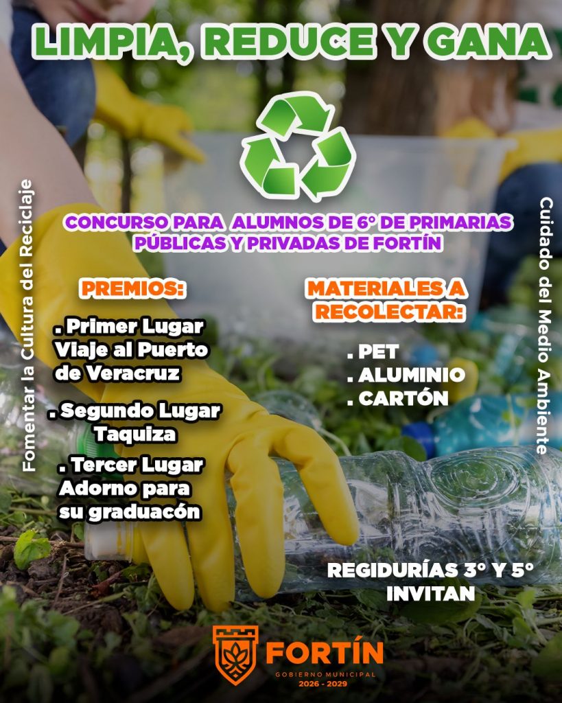 Fortín, Ver.- Lunes 19 Enero 2026- Para fomentar la cultura del reciclaje entre los alumnos de sexto grado de primaria, al tiempo de reconocer su esfuerzo con premios que celebren el cierre de su etapa escolar, el Ayuntamiento de Fortín, a través de las Regidurías Tercera y Quinta, encargadas de las comisiones de Limpia Pública y Educación, respectivamente, lanzó la campaña “Limpia, reduce y gana”.