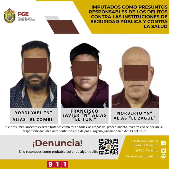 Xalapa, Ver., 19 de noviembre 2023.- La Fiscalía General del Estado, encabezada por Verónica Hernández Giadáns, a través de la Fiscalía de Investigaciones Ministeriales realizó imputación en contra de Yordi Yael “N” alias “El Zombi”, Norberto “N” alias “El Zague” y Francisco Javier “N” alias “El Tuki” como presuntos responsables de los delitos contra las instituciones de seguridad pública y contra la salud.