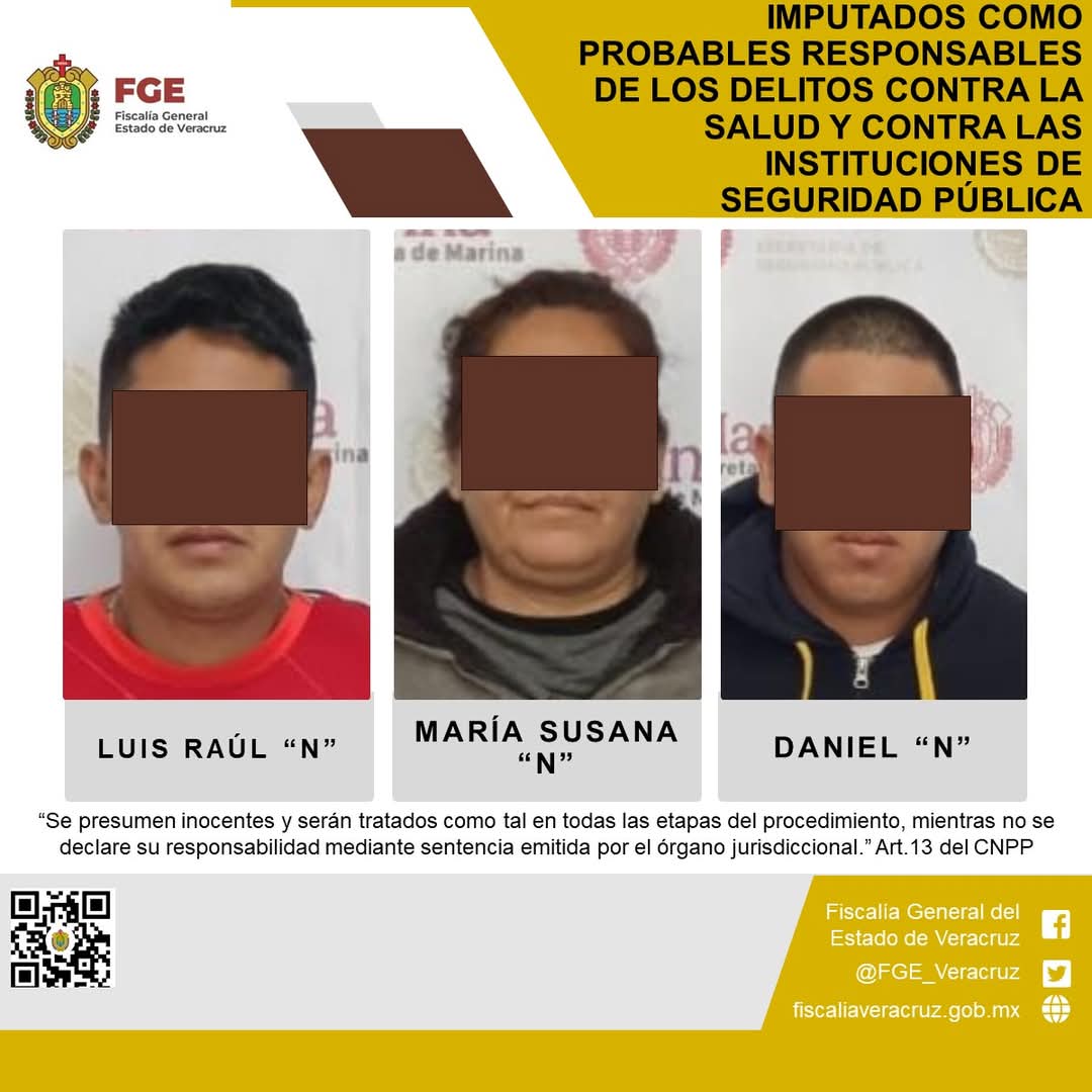 Jalacingo, Ver., 18 de abril de 2025.- La Fiscalía Regional Xalapa realizó imputación en contra de María Susana “N”, Daniel “N” y Luis Raúl “N” como probables responsables de los delitos contra la salud y contra las instituciones de seguridad pública.