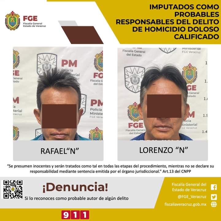 XALAPA, Ver; 25 de mayo del 2024.-La Fiscalía General del Estado informa, que un juez de control de este distrito judicial emitió imputación en contra de Lorenzo “N” y Rafael “N”, como presuntos responsables del delito de homicidio doloso calificado en agravio de la víctima P.Q.M., hechos ocurridos en diciembre del 2019, en la comunidad de San Miguel Tlalpoalan, del municipio de Altotonga.