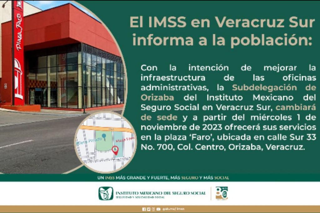 Con la intención de mejorar la infraestructura de las oficinas administrativas, la Subdelegación de Orizaba del Instituto Mexicano del Seguro Social (IMSS) en Veracruz Sur cambiará de sede y a partir del miércoles 1 de noviembre ofrecerá sus servicios en la  Plaza “Faro” ubicada en calle sur 33, No. 700, Col. Centro, Orizaba, Veracruz.