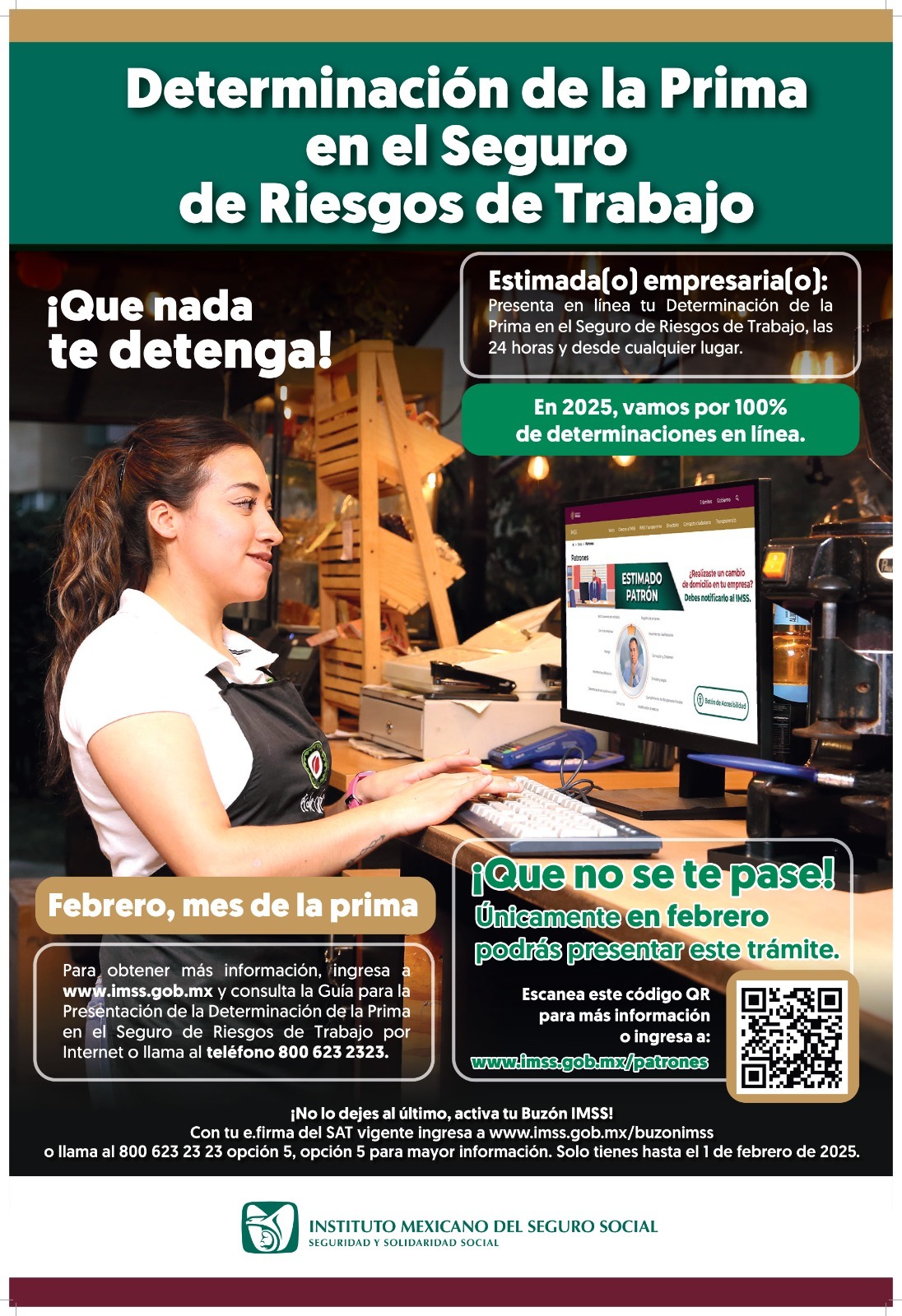 El Instituto Mexicano del Seguro Social (IMSS) en Veracruz Sur informa al sector patronal que durante febrero deberán presentar la Determinación de la Prima en el Seguro de Riesgos de Trabajo derivada de la revisión anual de siniestralidad, por lo que, se exhorta a cumplir en tiempo y forma a fin de evitar sanciones.