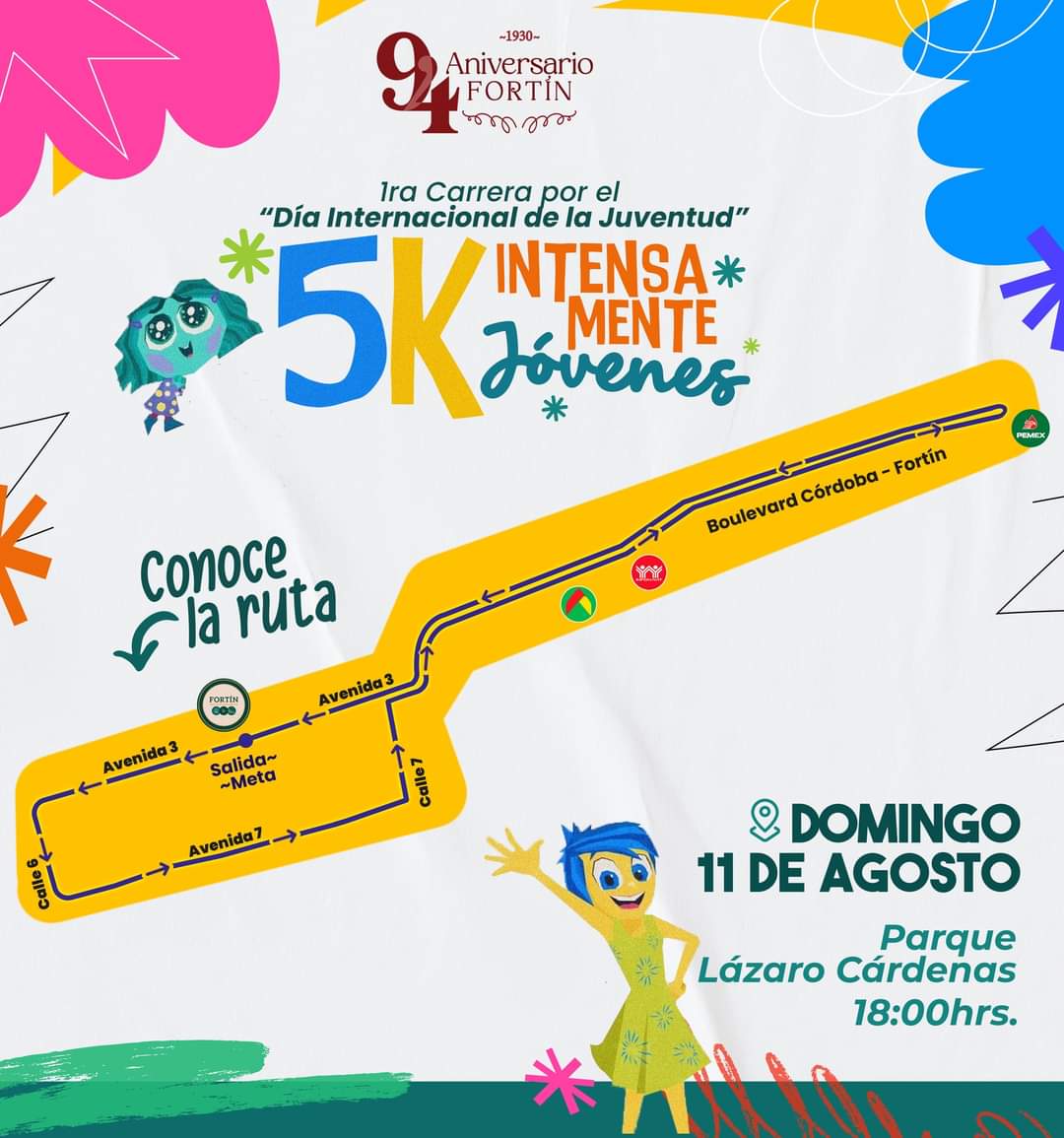 Fortín, Ver.- El H. Ayuntamiento a través del Instituto de la Juventud invitan a la carrera 5 km «Intensamente Joven» en Conmemoración al Día Internacional de la Juventud, misma que se llevará a cabo el próximo domingo 11 de agosto a las 18:00 horas.