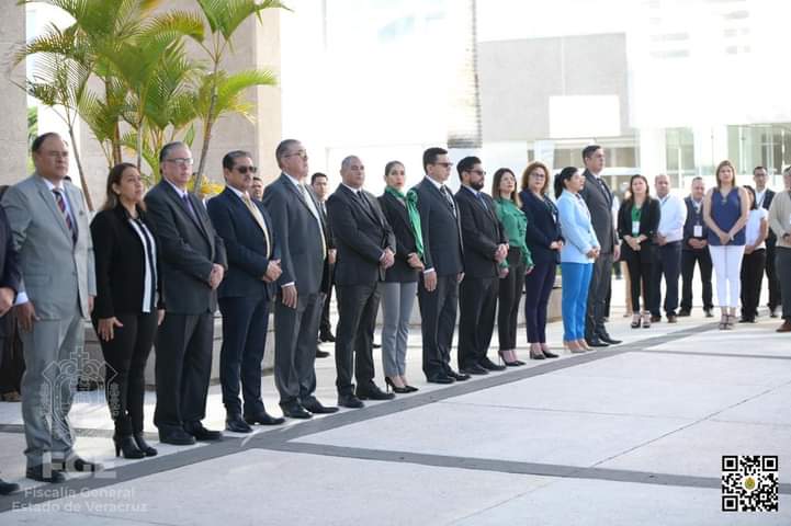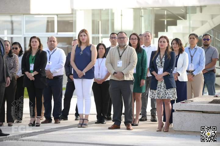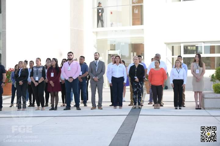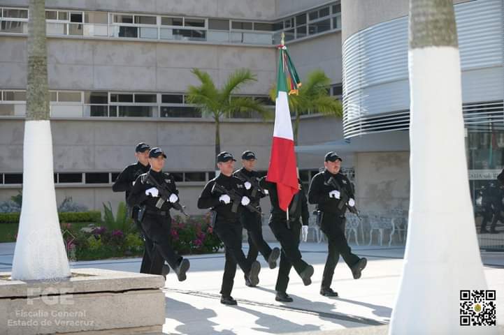 Xalapa, Ver.,a 21 de agosto de 2023.-La Fiscal General del Estado, Verónica Hernández Giadáns, encabezó en oficinas centrales, la ceremonia de honores a la bandera, que correspondió organizar a las y los servidores públicos que integran la Dirección General del Órgano Especializado en Mecanismos Alternativos de Solución de Controversias, quienes pronunciaron el juramento a la bandera y leyeron las efemérides de la semana, después de presenciar el abanderamiento de la escolta, conformada por elementos de la Policía Ministerial.