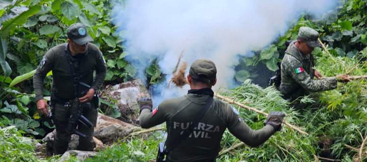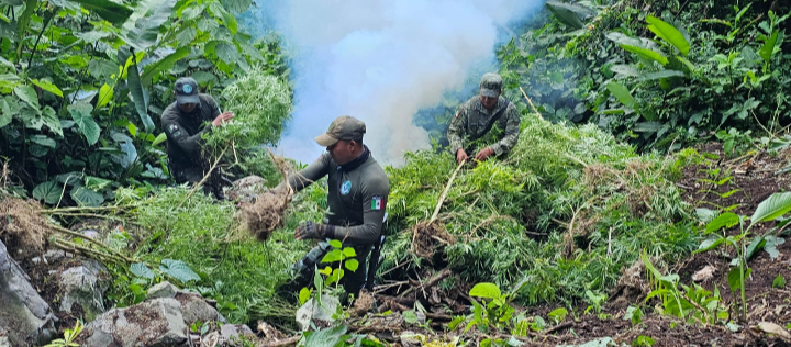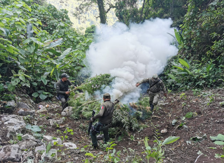 En hechos distintos, los oficiales realizaban recorridos en la localidad La Mirra de Texcatepec, cuando localizaron 600 plantas de hierba verde similar a la marihuana.