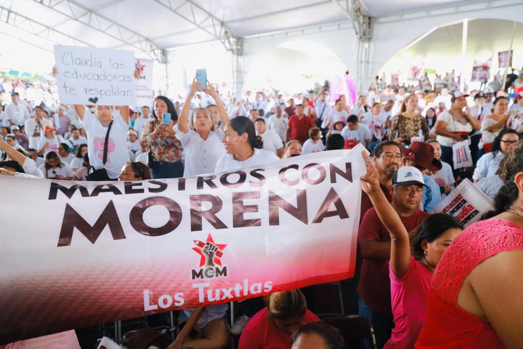 Catemaco, Ver., 13 de julio de 2023.- Miles de docentes integrantes de la organización Maestros Con Morena (MCM) refrendaron su apoyo y respaldo a la aspirante a la Coordinación Nacional de la Defensa de la Cuarta Transformación, Claudia Sheinbaum Pardo, durante su visita a este municipio.